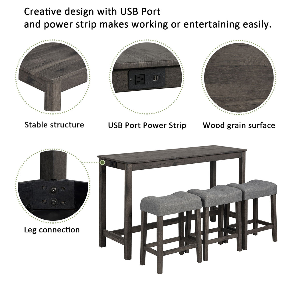 4 Piece Bar Table Set With Power Outlet, Bar Table Set With Chairs, Sofa Bar Table With Stools, Behind Couch Table With 3 Padded Stools, For Living Room, Dining Room - Dark Gray
