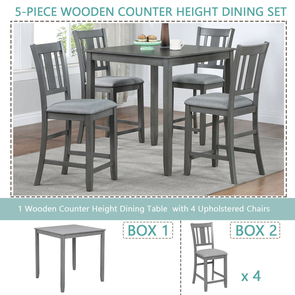 5 Pieces Dining Table Set, Wooden Dining Square Table Set For 4, Counter Height Kitchen Table Set With Square Table And 4 Upholstered Chairs For Small Space - Gray