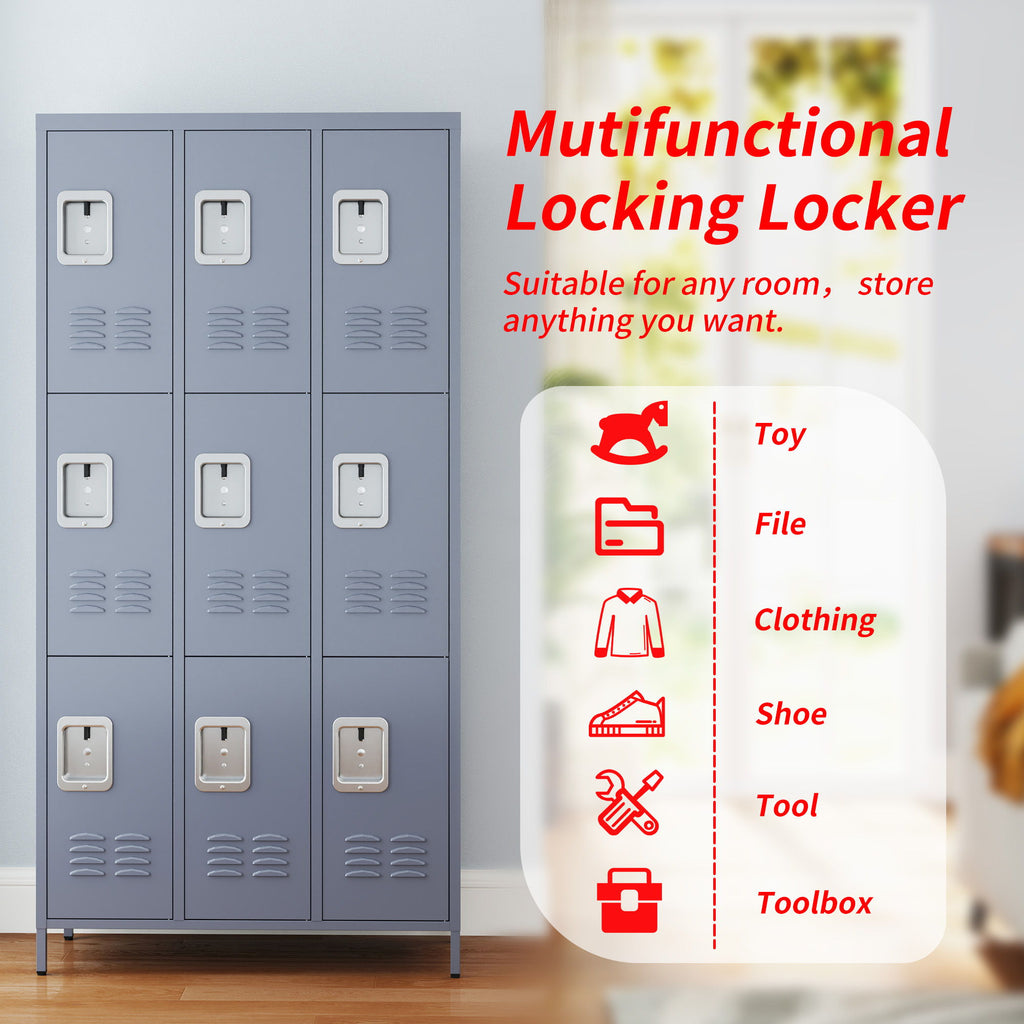 9 Door Lockers With Lock For Storage In Office, School, Gym, And Bedroom - Gray