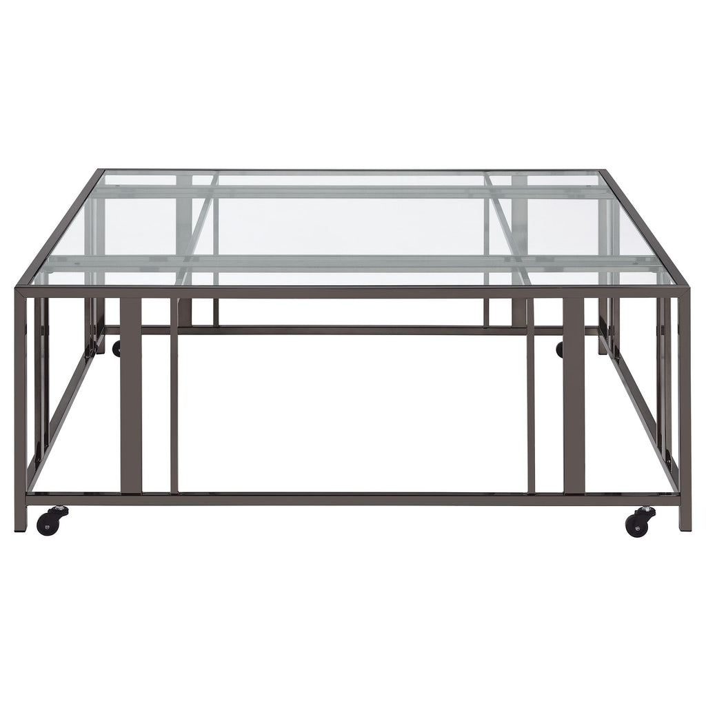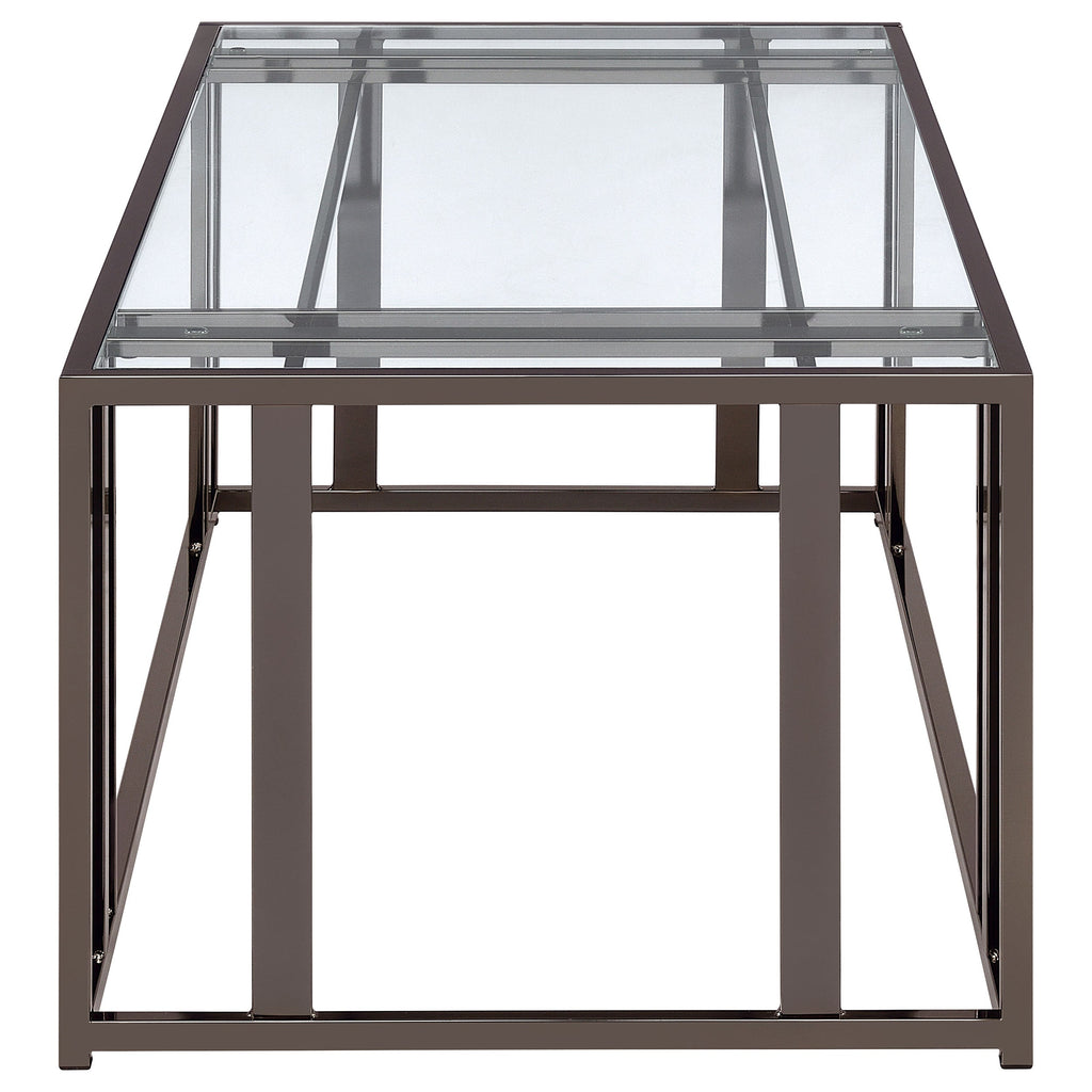 This modern rectangular coffee table features a clear tempered glass top paired with a geometric base made from heavy-gauge metal with a sleek electroplated finish. The open design offers a contemporary aesthetic, blending elegance with durability. Perfect for displaying decor or organizing essentials, its scratch-resistant materials ensure lasting quality. The compact design makes it an ideal addition to any living room, lounge, or small space.