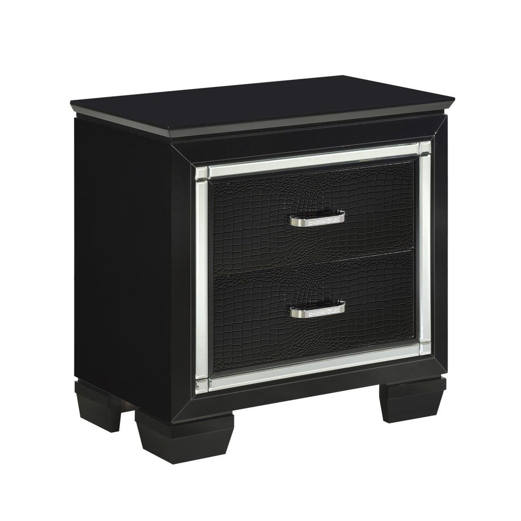 Glamour reigns in the design of the Allura Collection. Framing the nightstand is a decorative beveled mirror accent that enhances the the under-light of the night stand. Alligator embossing and high polished crystal-enhanced hardware boldly accent the finish.