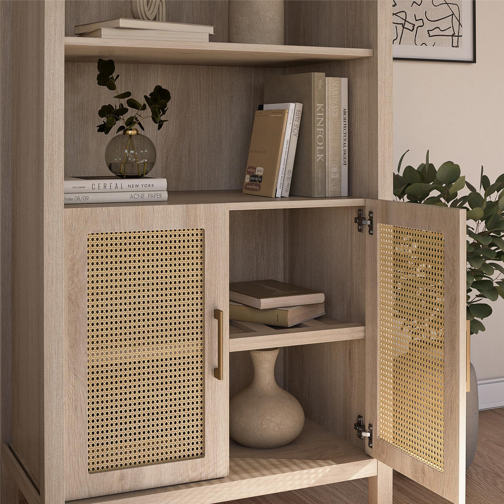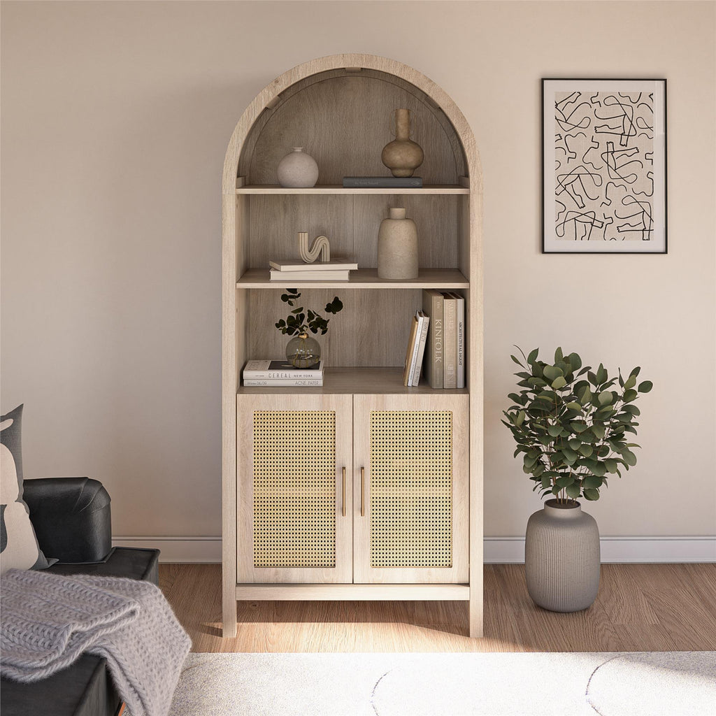 - Bohemian Arched Design: Features an elegant arched profile with faux rattan doors and light oak woodgrain finish for a sophisticated look in any room