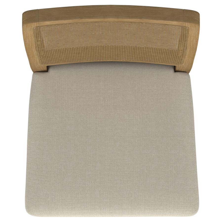 Rustic elegance and tailored design unite in this striking dining set, blending relaxed materials with refined structure. The round table features a sand wash finish over a smooth white ash veneer top, supported by clean cylindrical legs and an arched aged brass stretcher. Coordinating side chairs add contrast with handwoven rattan backs, soft upholstered seats, and sleek metal stretchers. Built from solid rubberwood, engineered wood, and natural textures, this set brings everyday comfort to modern rustic dining.