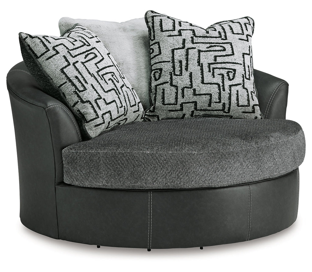 Appeal to your eye for ultra-contemporary design with this oversized swivel chair. Chic and sleek in dark neutrals, it pairs cozy fabric with faux leather for invitingly cool character. And with its robust size offering extra seating space, you can chill out in comfort and style.