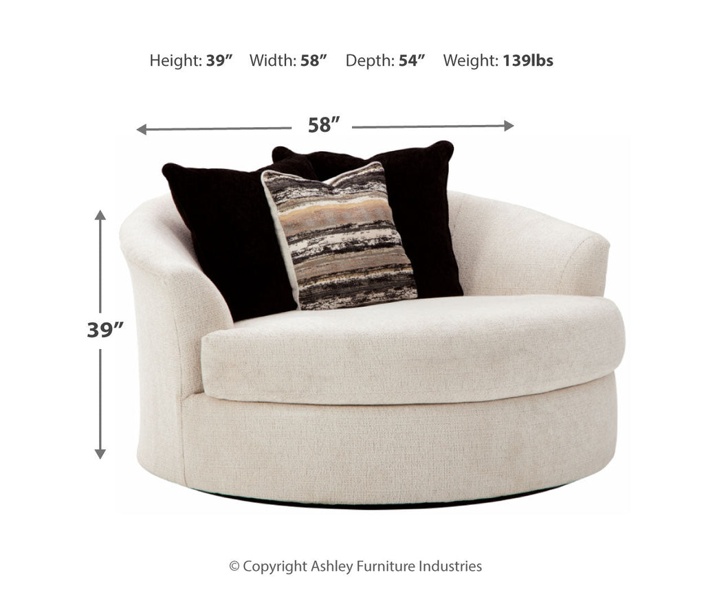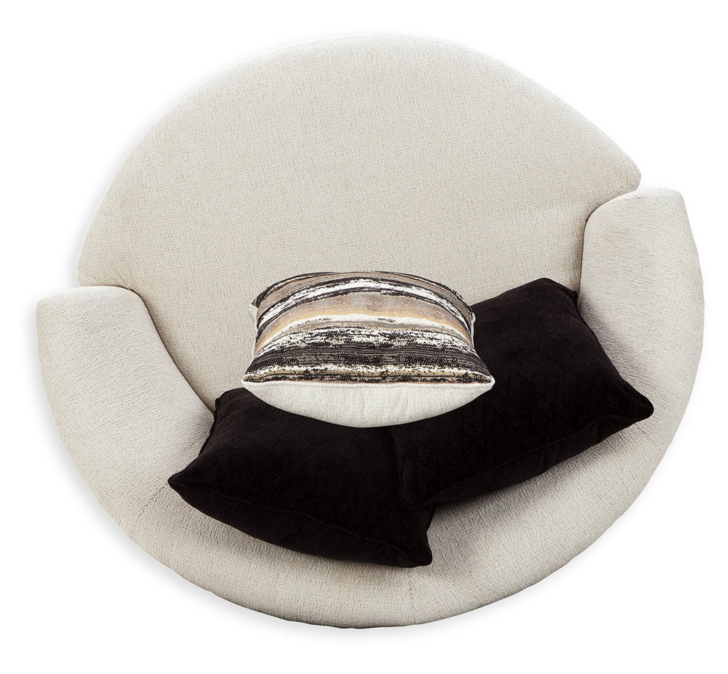 Let it snow. Doubling your pleasure with a spacious seating area with room for two—or just you—this oversized round swivel chair in a snow-tone neutral invites you to stretch your style in an easy-elegant way. Whether your aesthetic is urban hip or suburban chic, this posh swivel chair is sure to look and feel right at home. Wrapped in a chunky heavyweight chenille fabric with a delightful touch, this fashion-forward chair includes designer pillows for a brilliant pop of color and texture.