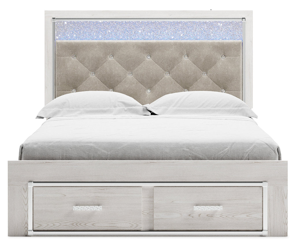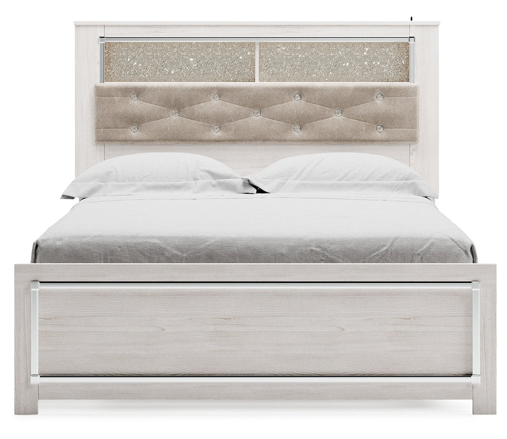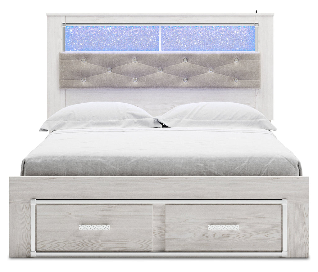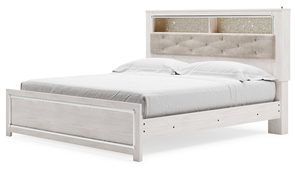 The epitome of fashion-forward design, this king upholstered bookcase bed is a beautiful blend of comfort and luxury. Shiny chrome-tone accents, a pearlized finish and button-tufted upholstery bring a glam touch to the richly rustic appearance. Remote-controlled LED lighting adds style and modern convenience to your restful retreat.