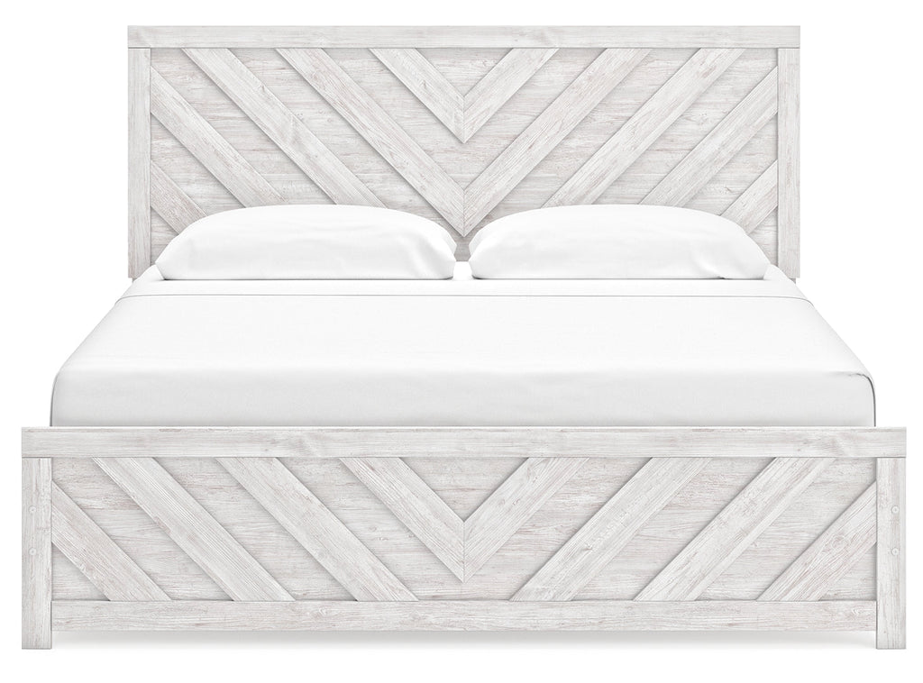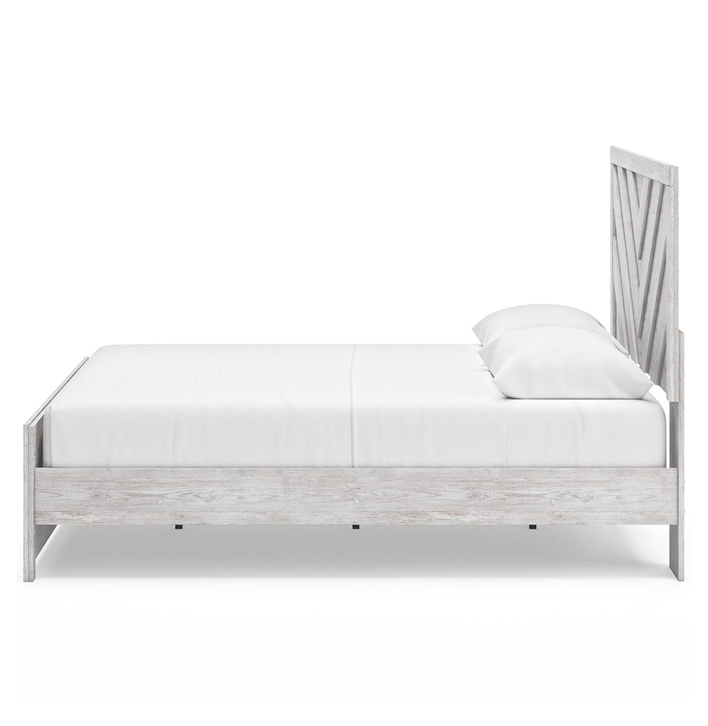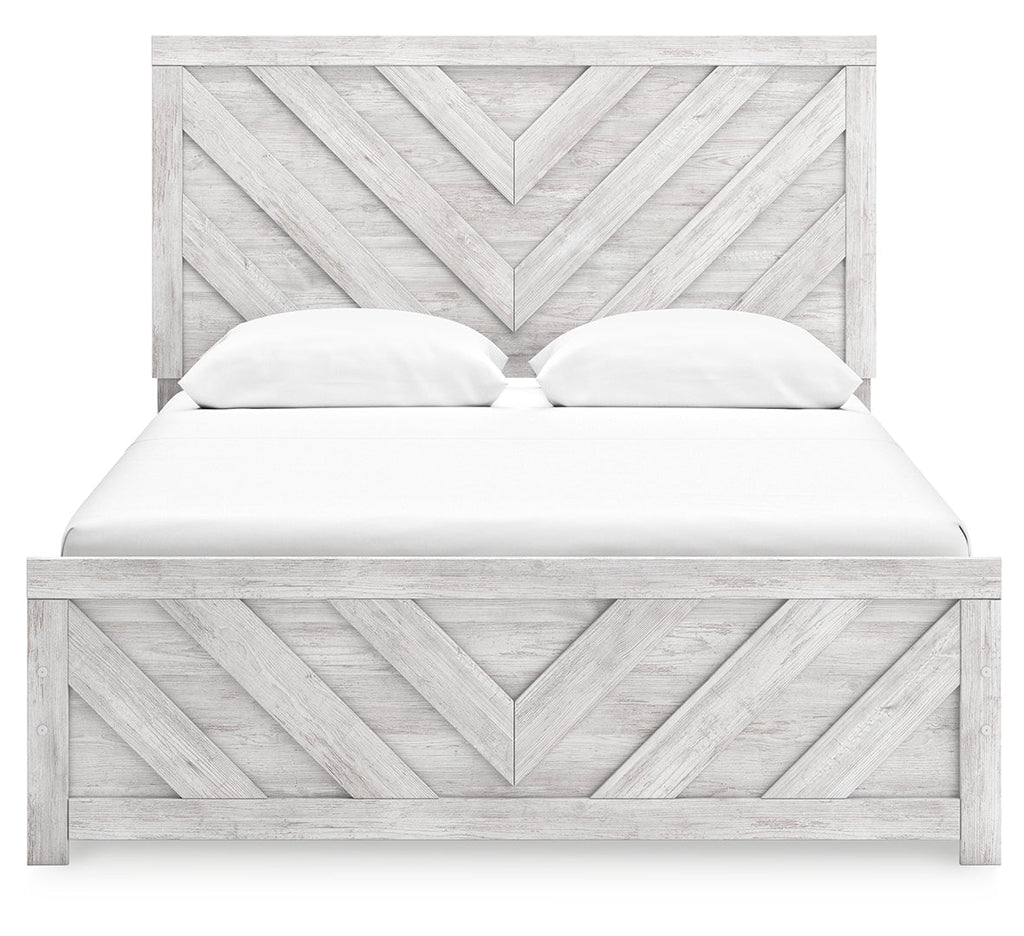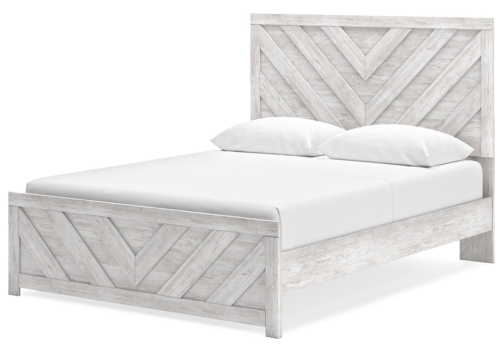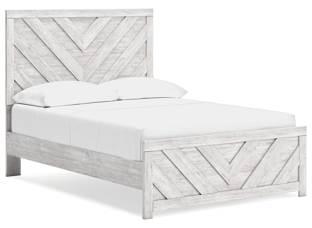 Charmingly designed, this full panel bed embraces the aesthetics of countryside living and repurposes them for modern settings. Its whitewash paint, replicating the wear and tear of time, appeals to your love of vintage character. And a chic chevron pattern on the headboard and footboard keeps your bedroom effortlessly on trend.