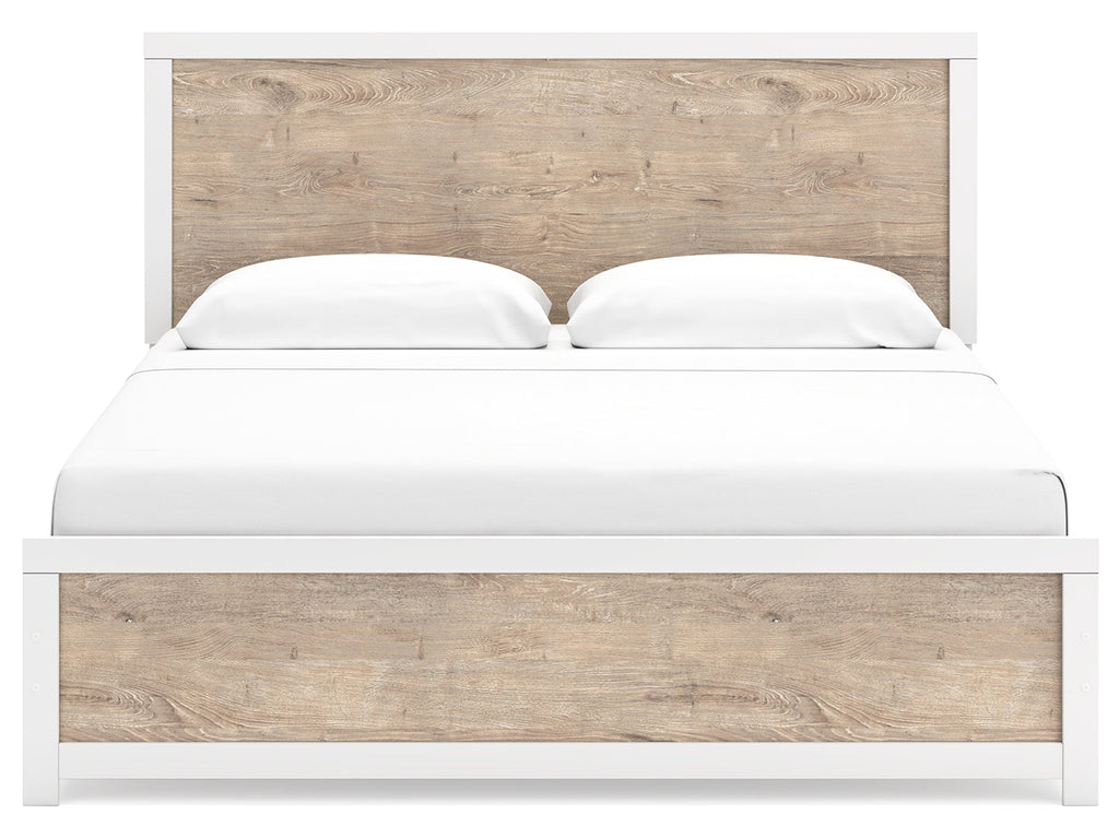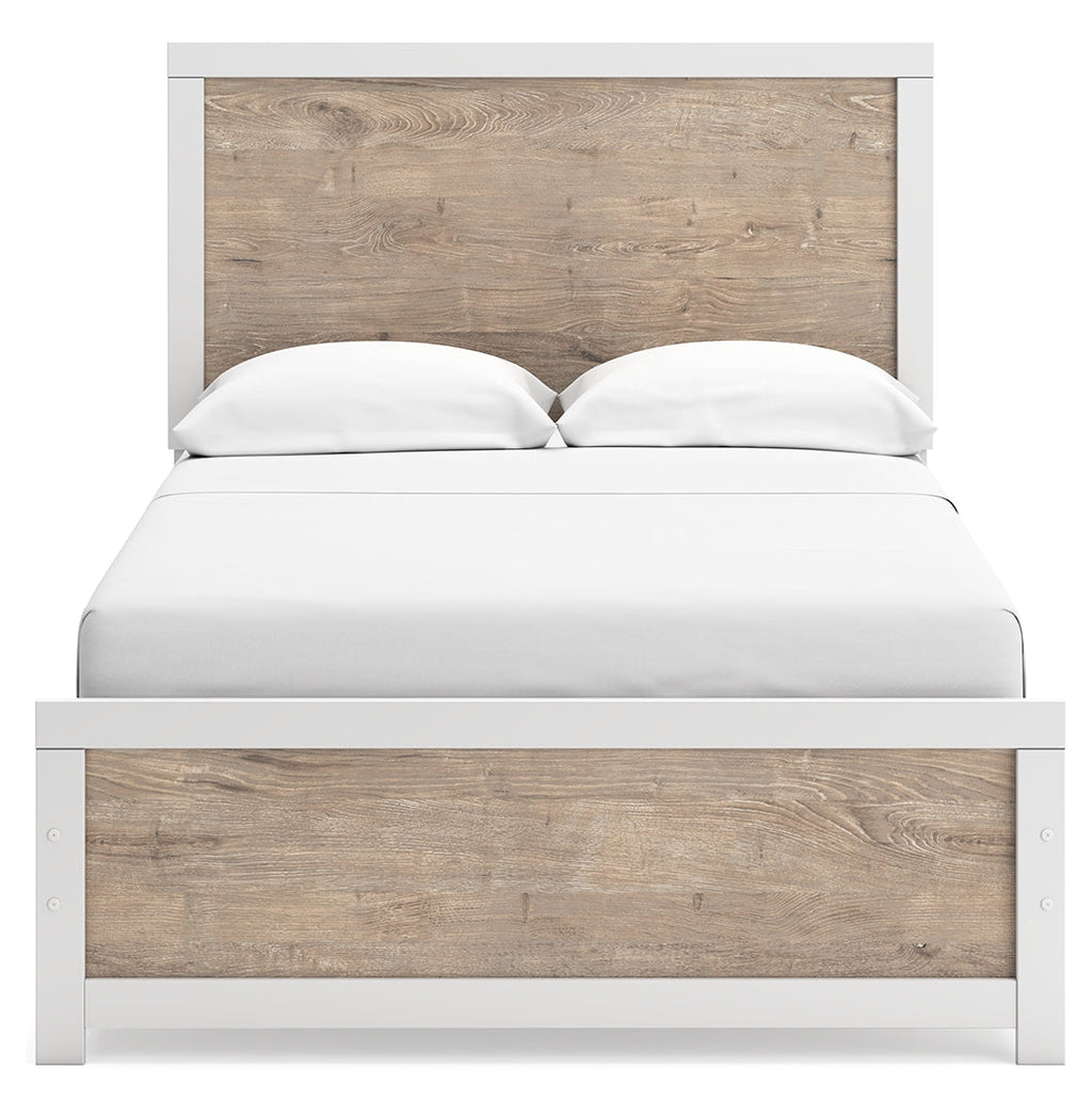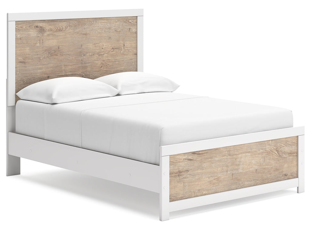 Relaxed yet striking, this full panel bed brings casual beauty and function to your dream destination. A delightful two-tone treatment blends a fresh, replicated oak grain with a matte white finish that's easy to love. Its simplicity lends a contemporary touch that suits your bedroom's style to a T.