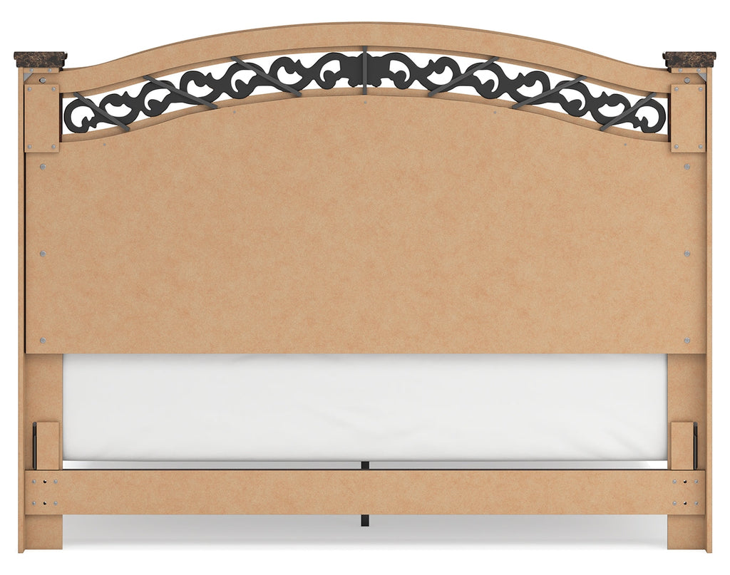 Timeless and classic, this king poster bed offers a grand design accented with rich hues and eye-catching details. Stately from every angle, its sophisticated elements blend together to display your love of traditional aesthetics. The headboard further elevates the look with ornate detailing at its crown.