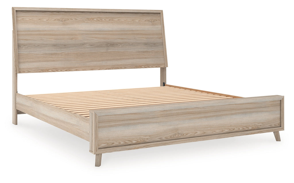 Modern meets neutral and sophisticated in this king panel bed. Its clean lines and open slat headboard wake up your bedroom with eye-catching appeal. The natural finish and subtle replicated wood grain speak casual simplicity, creating a smart and stylish bedroom retreat. A refreshing take on style, indeed.