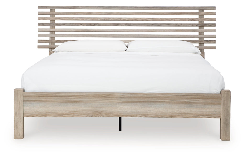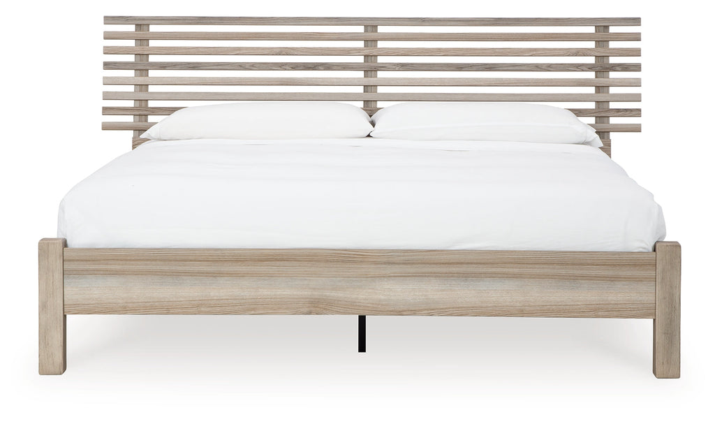 Modern meets neutral and sophisticated in this king panel bed. Its clean lines and open slat headboard wake up your bedroom with eye-catching appeal. The natural finish and subtle replicated wood grain speak casual simplicity, creating a smart and stylish bedroom retreat. A refreshing take on style, indeed.