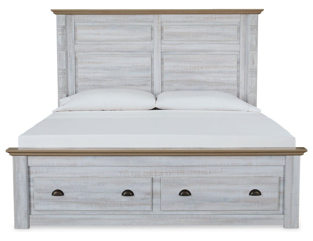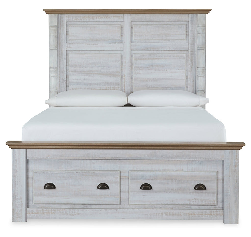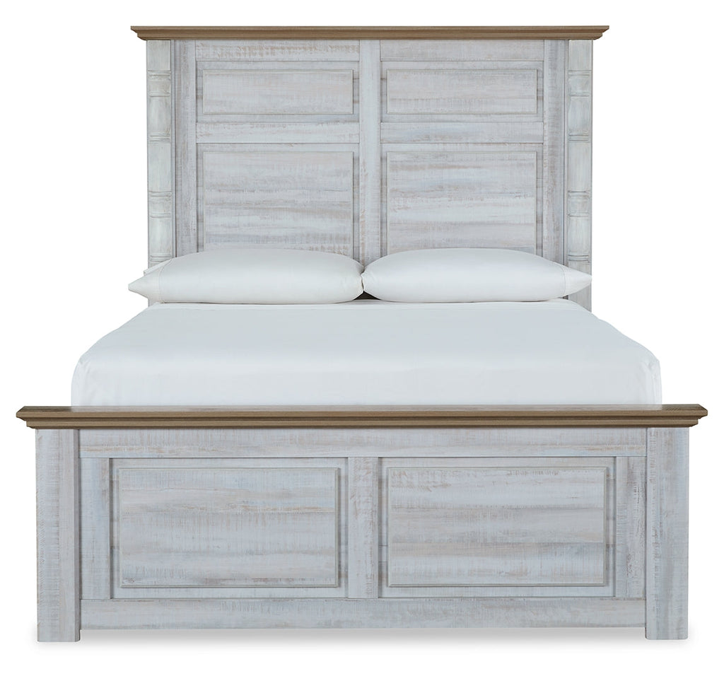 Beautifully simple yet rich with character, this king panel bed is a dream come true. It masters the art of simplicity with charming two-tone style. The gently weathered white finish is complemented by replicated oak grain on the headboard and footboard. Crown moulding and decorative turned posts add appeal. If farmhouse style is calling your name, answer with this timeless treasure.