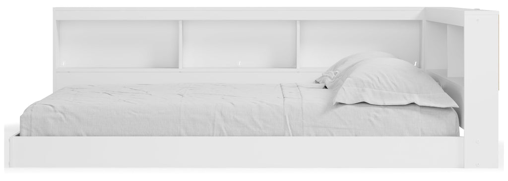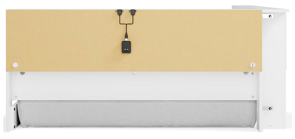 This full bookcase storage bed is an inspired find, beautifully blending contemporary and casual style. Its two-tone look in matte white and a replicated sugarberry wood grain pattern keeps things simple, while the bookshelf storage creates added function. This charming storage bed also offers slim-profile dual USB chargers and requires no additional foundation.