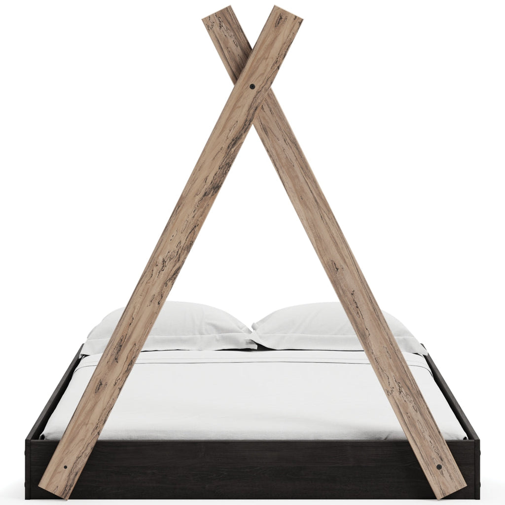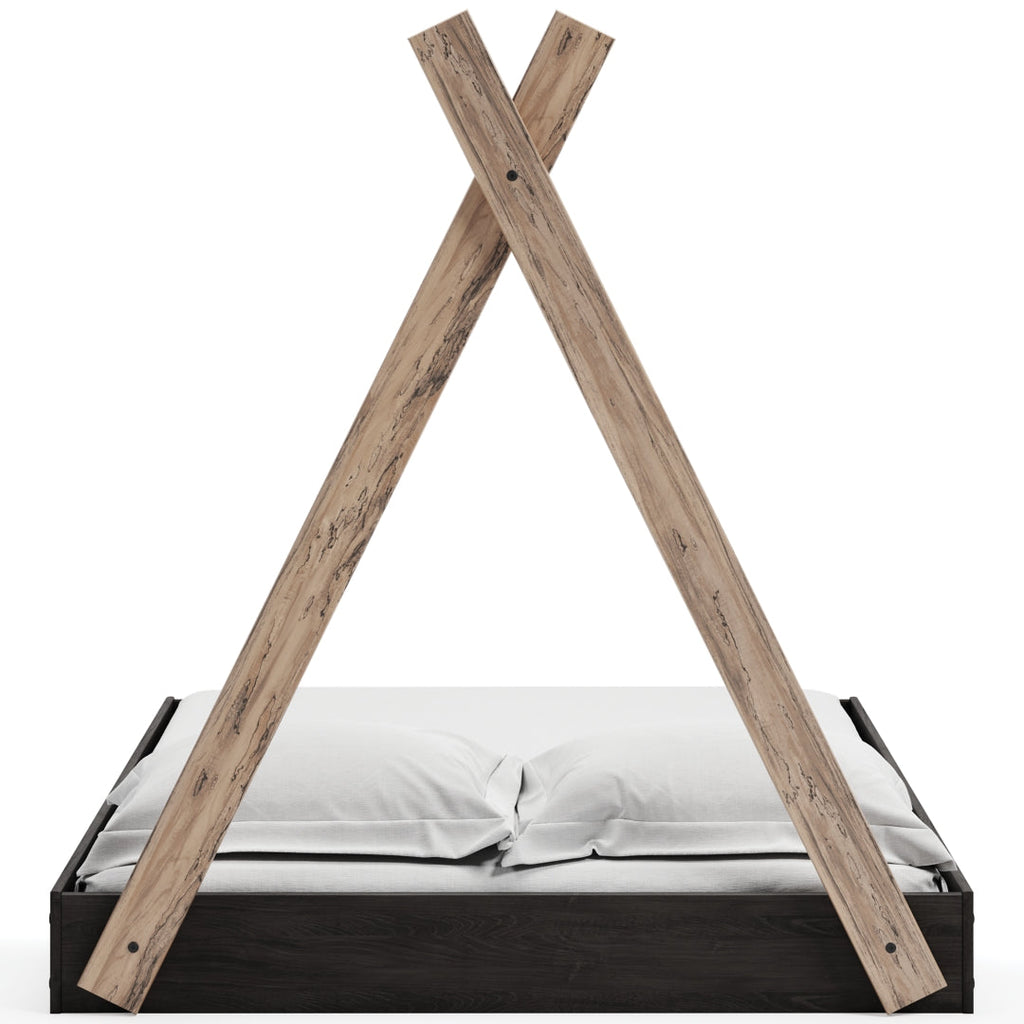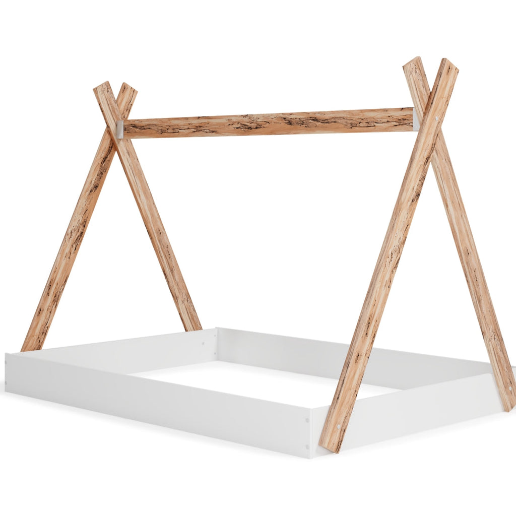 Adventure awaits with this full tent complete bed in a box. The effortless blend of contemporary and casual style features an expressive two-tone look in a solid matte white finish and a replicated sugarberry wood grain pattern. This complete bed in a box requires no additional foundation, making it a functional yet unique addition to your home.