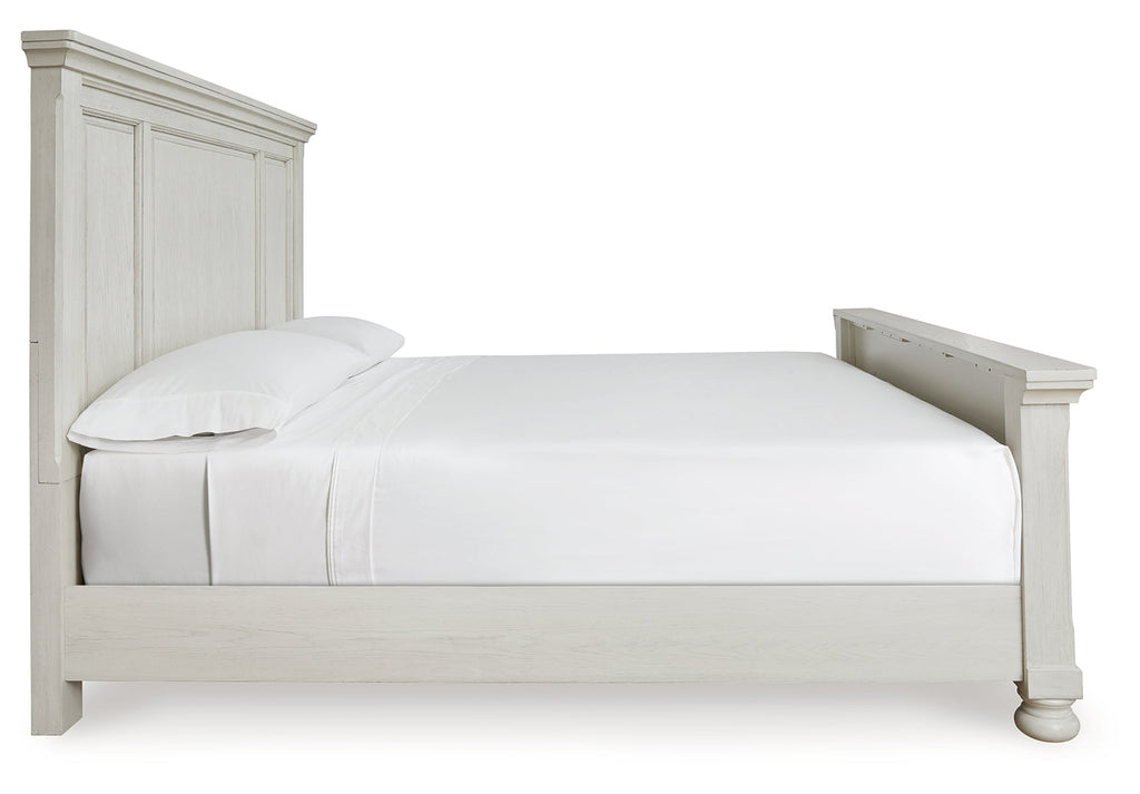 Elegant, timeless furnishings take your bedroom to the next level. Nothing does that better than this king sleigh bed with storage footboard. The antiqued white finish with a wonderful grain texture radiates sophistication, while the dark bronze-tone hardware adds an ornate touch. Rounding things out, the subtle curve of the headboard keeps the look polished and poised.
