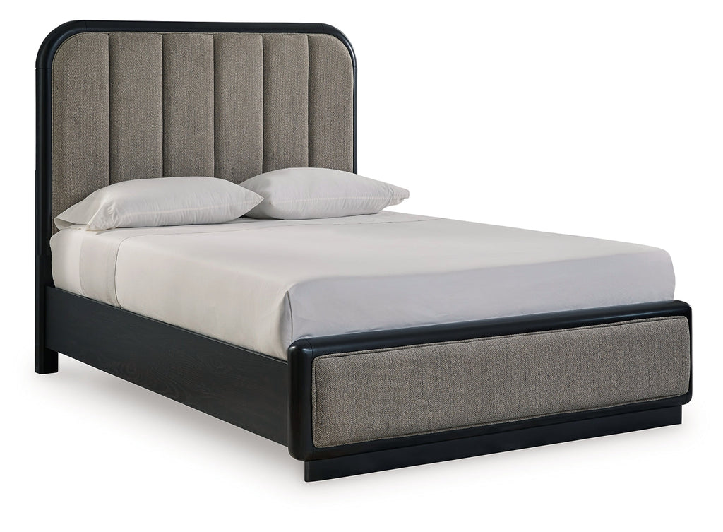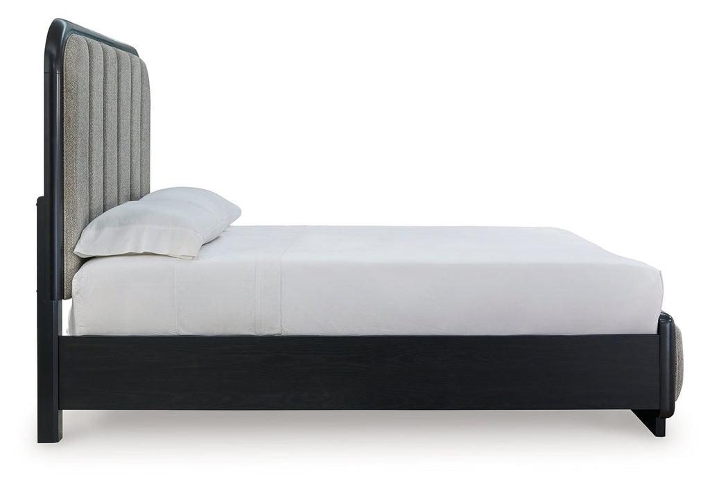 Inspired by art deco design, this softly shaped California king upholstered panel bed makes a lasting impression in a simply stunning way. Its magnificent curved silhouette is enhanced by a rich layered black finish on the textured wood grain surface. The channeled vertical headboard and footboard, wrapped in herringbone textured upholstery, merge form and function. This is the statement piece you’ve been dreaming of to elevate your contemporary inner sanctum.
