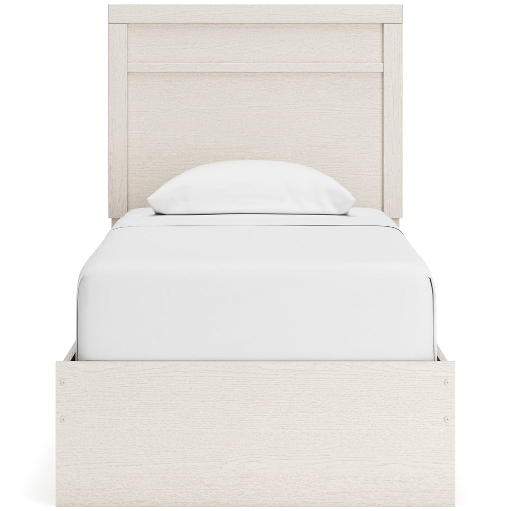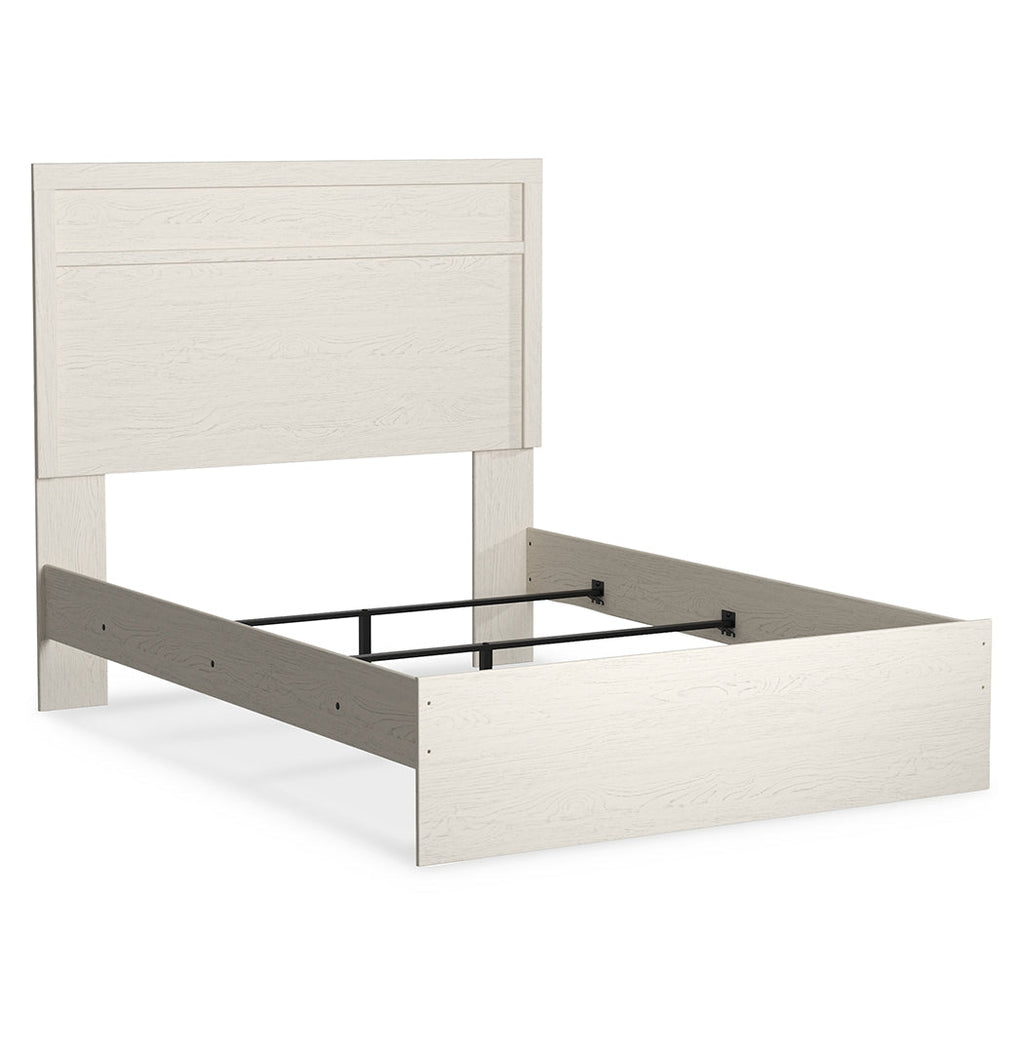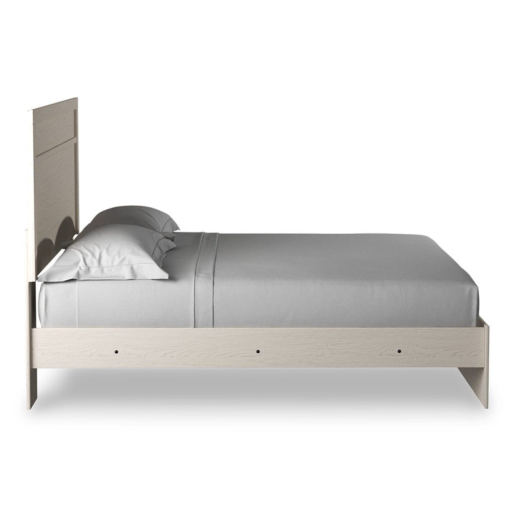With its clean-lined look and modern attitude, this full panel bed is a fresh style awakening. A crisp, white hue over subtle replicated wood grain easily complements other furniture finishes. The simple, unadorned profile is given depth and dimension with the addition of plank-style moulding on the headboard—proof that beauty lies in the details.
