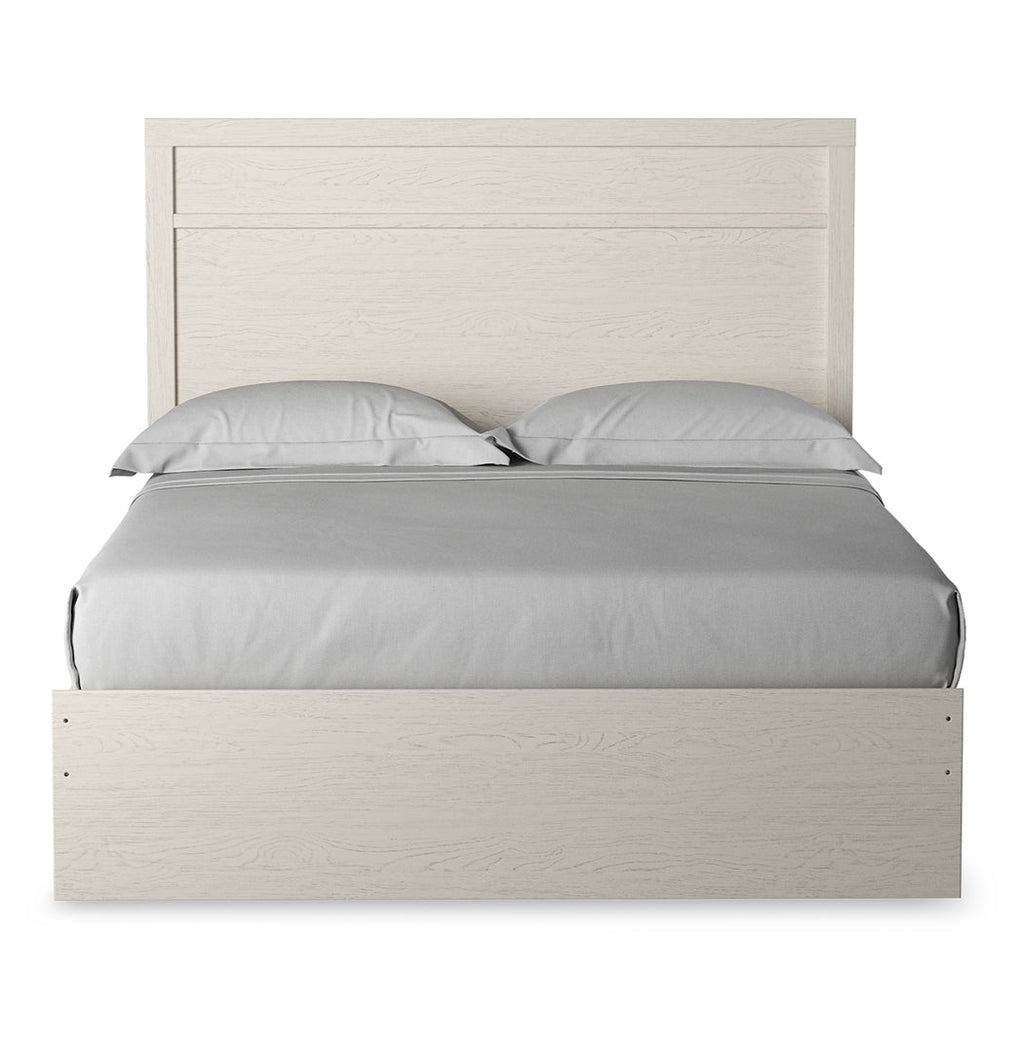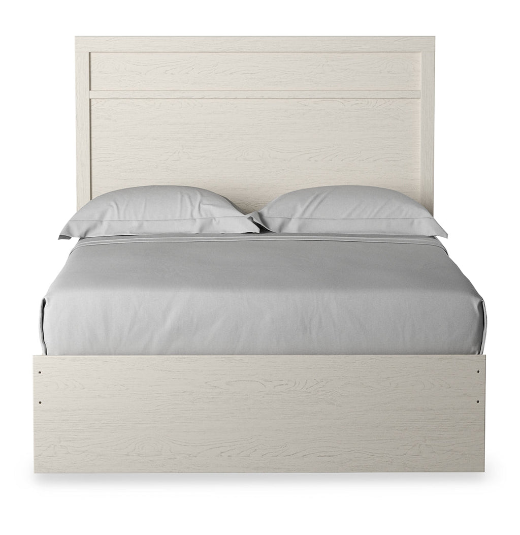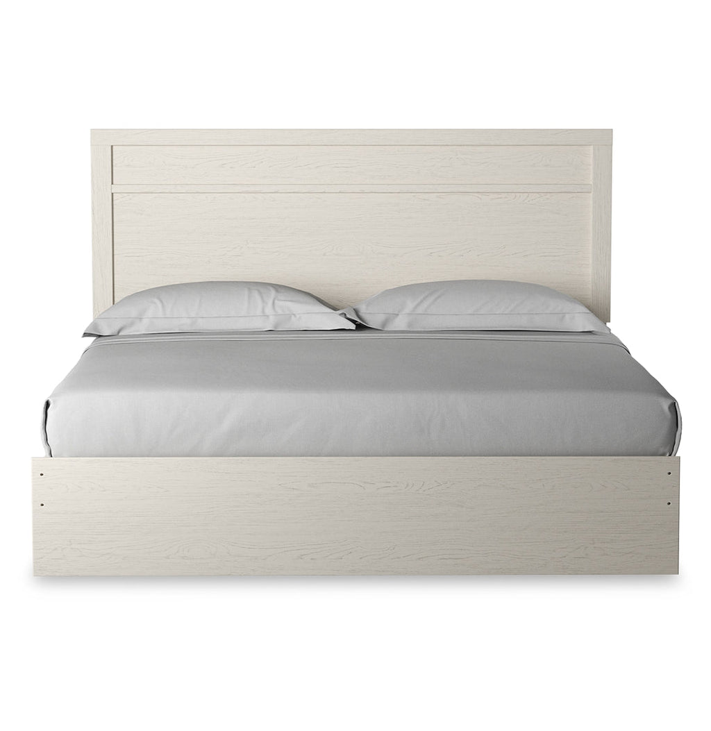 With its clean-lined look and modern attitude, this full panel bed is a fresh style awakening. A crisp, white hue over subtle replicated wood grain easily complements other furniture finishes. The simple, unadorned profile is given depth and dimension with the addition of plank-style moulding on the headboard—proof that beauty lies in the details.