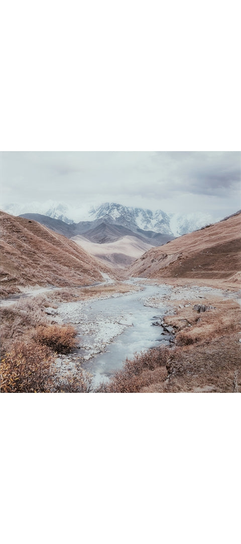 This landscape wall art brings the beauty of nature into your home. Printed on glass, it combines timeless artistry with innovative technology. The meandering stream and muted mountains evoke a serene ambiance, lending gallery-worthy charm.