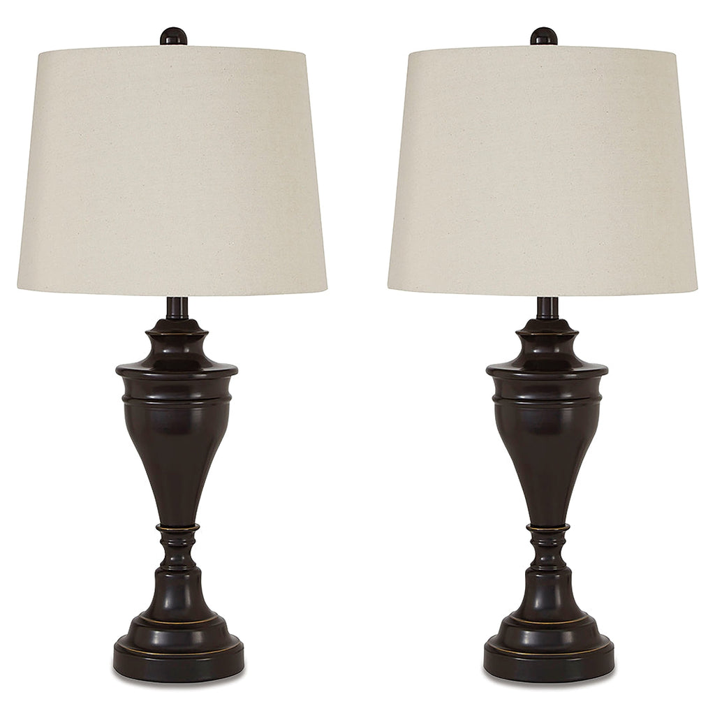 A delightfully turned pedestal base gives this table lamp a sense of easy elegance. Its dark bronze-tone metal is a simply stylish counterpoint.