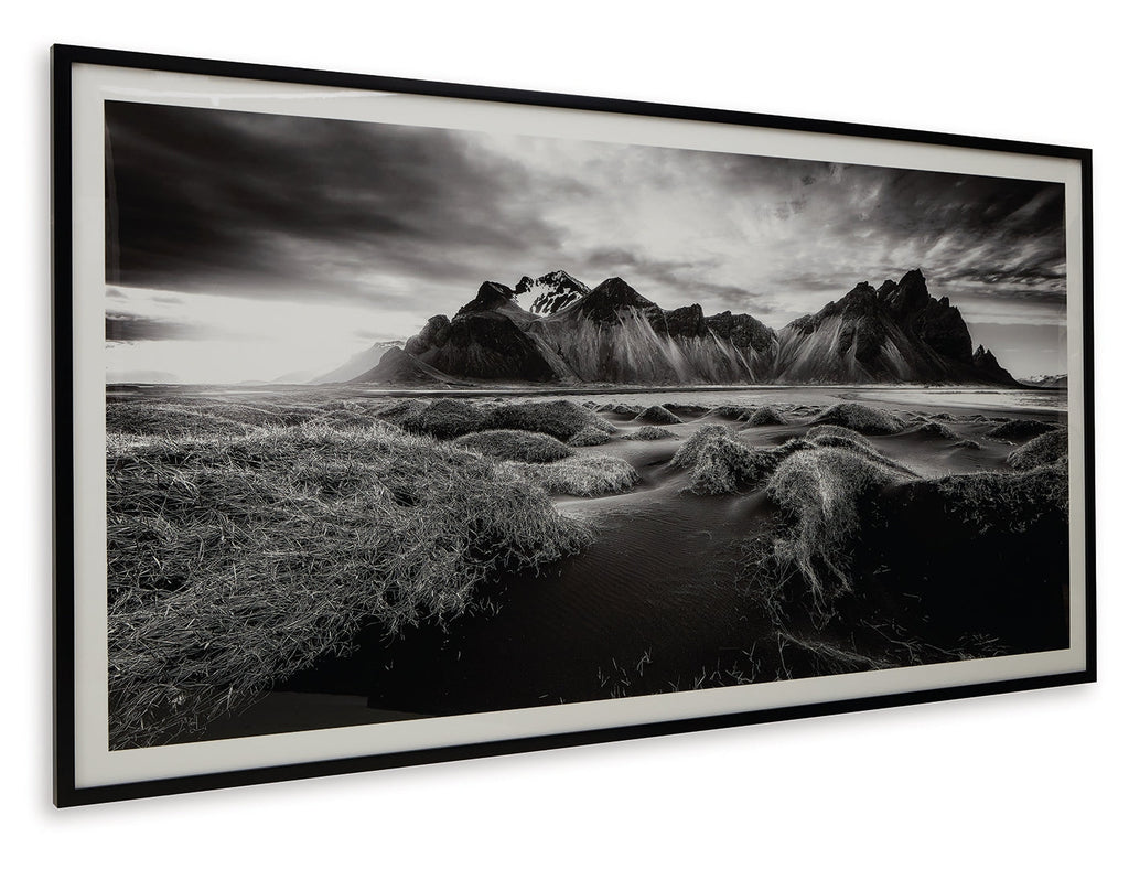 If you have your sights set on a striking landscape, this wall art is a natural wonder. Staggeringly beautiful, the framed black and white print showcases majestic mountains and a meandering stream. This moody and marvelous piece adds an air of dramatic beauty to your modern decor.