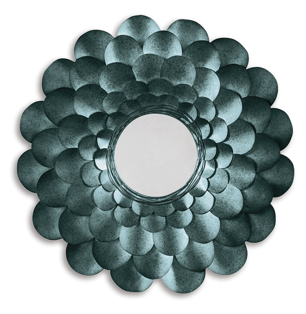 Petal to the metal. Wowing in a multifaceted blue that’s completely unexpected, this accent mirror stands out from the crowd in such a beautiful way. Exquisite flower frame with layers of luminous metal petals is the perfect pick for bringing a touch of flirt and flair to an entry, mantel, bedroom or vanity space.