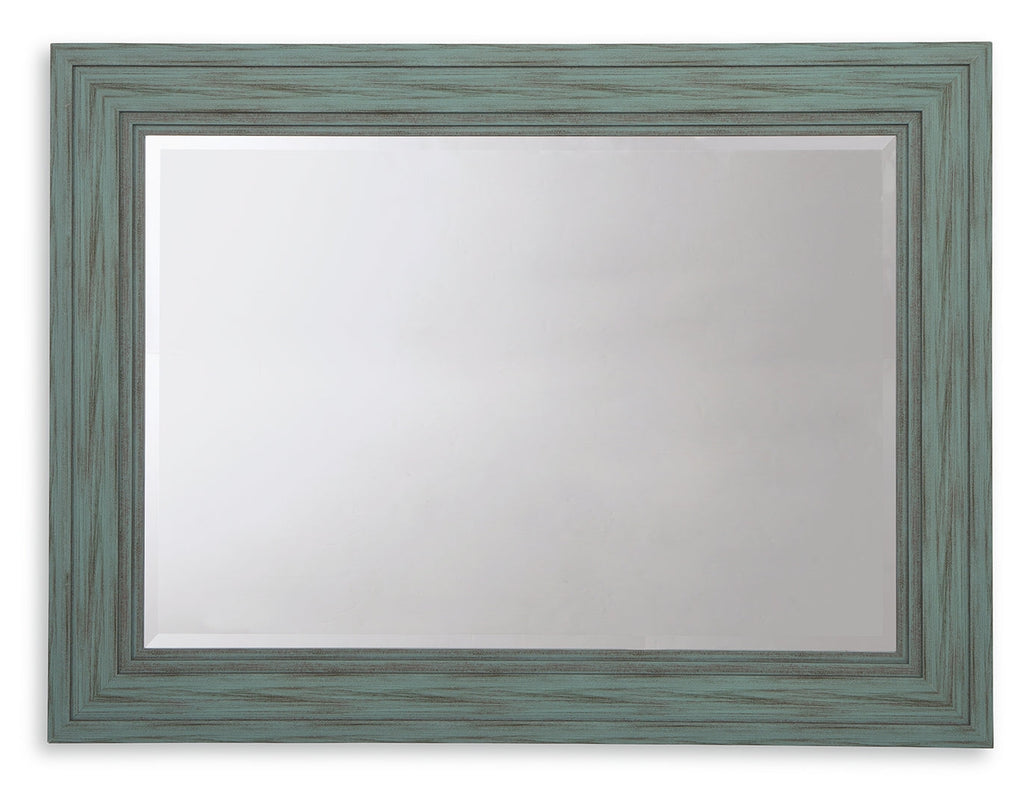 Transform your space into a vintage casual retreat. This floor mirror adds dimension while remaining versatile, with the ability to... Transform your space into a vintage casual retreat. This floor mirror adds dimension while remaining versatile, with the ability to hang both vertically and horizontally. The antiqued teal finish adds a pop of color, making this mirror a must-have. Accent mirror with 1" bevel Antiqued teal finish D-ring bracket for hanging Vertical or horizontal hanging View more