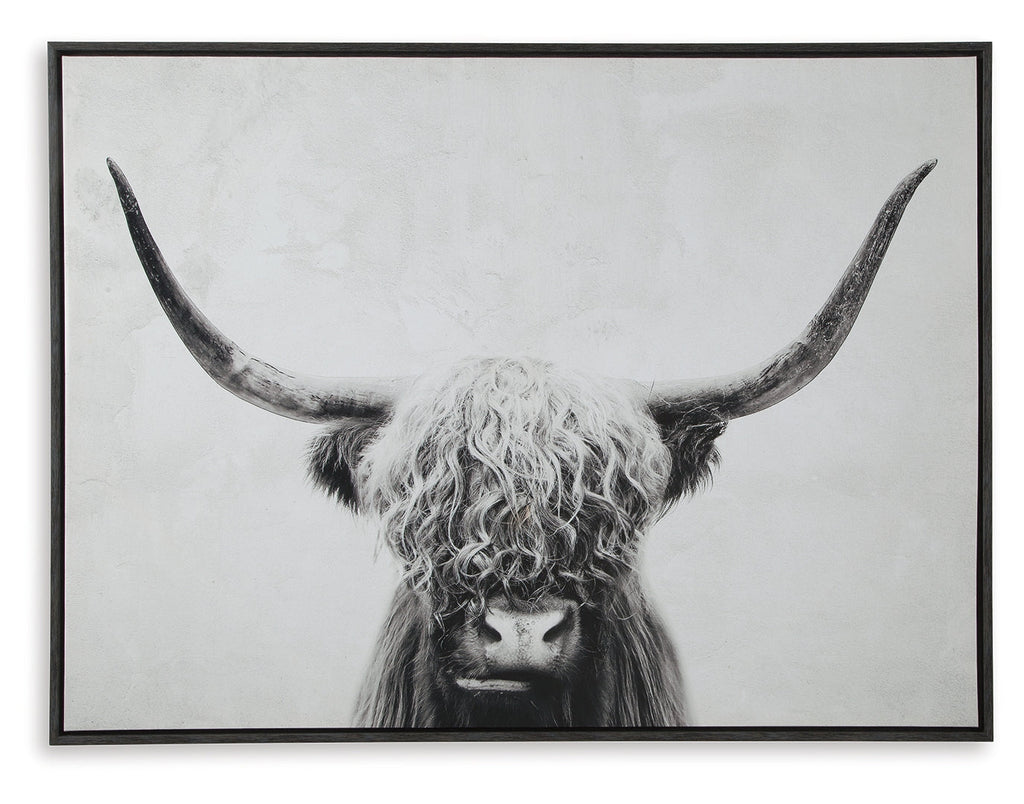 Bring home a piece of Scottish livestock with this wall art. A highland cow looks straight ahead with shaggy hair and prominent horns, creating a beautiful white negative space. The sleek black frame creates a boundary for the piece, which is sure to make a statement in your home.