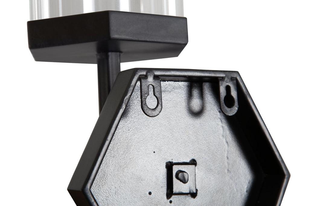 Unique and stylish, this hurricane pillar wall sconce complements all styles of interiors. With its geometric metal design and clear glass hurricane, the piece adds distinctive flair to your living space.