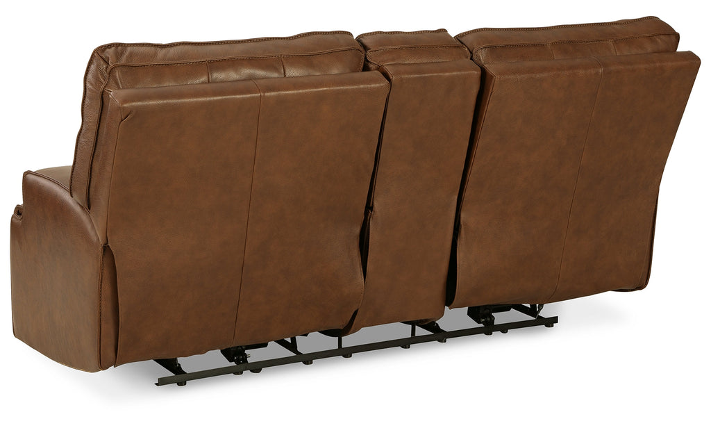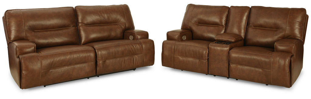 Master statement-making contemporary comfort with this power reclining package. It displays striking yet streamlined profiles, with auburn-hued leather in the spacious seating areas balancing natural beauty and refined design. Adjustable headrests and USB charging polish off this richly crafted set.