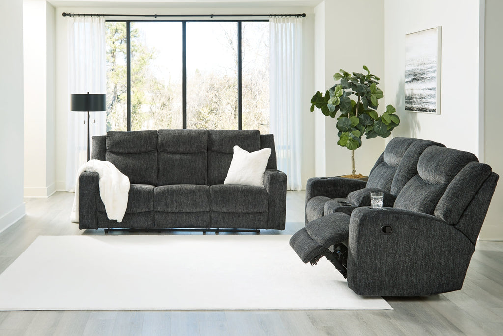 Ideal for those who seek synergy of form and function, this seating package is made for everyday indulgence. Its motion features are decidedly modern; the upholstery velvety soft. A versatile, dark neutral hue takes you back to style basics. Track arms frame the chunky profiles, completing this relaxed approach to contemporary decor.