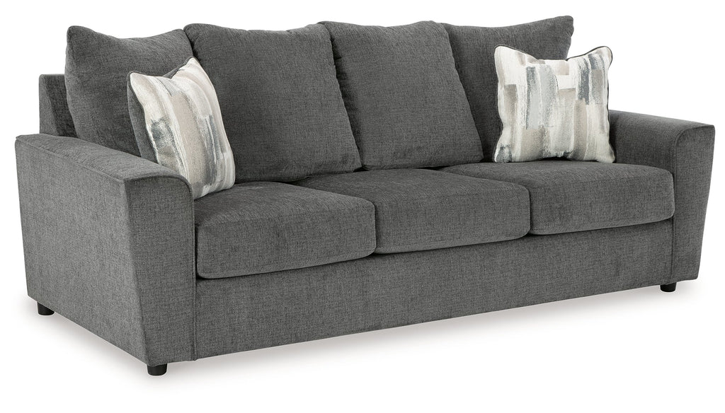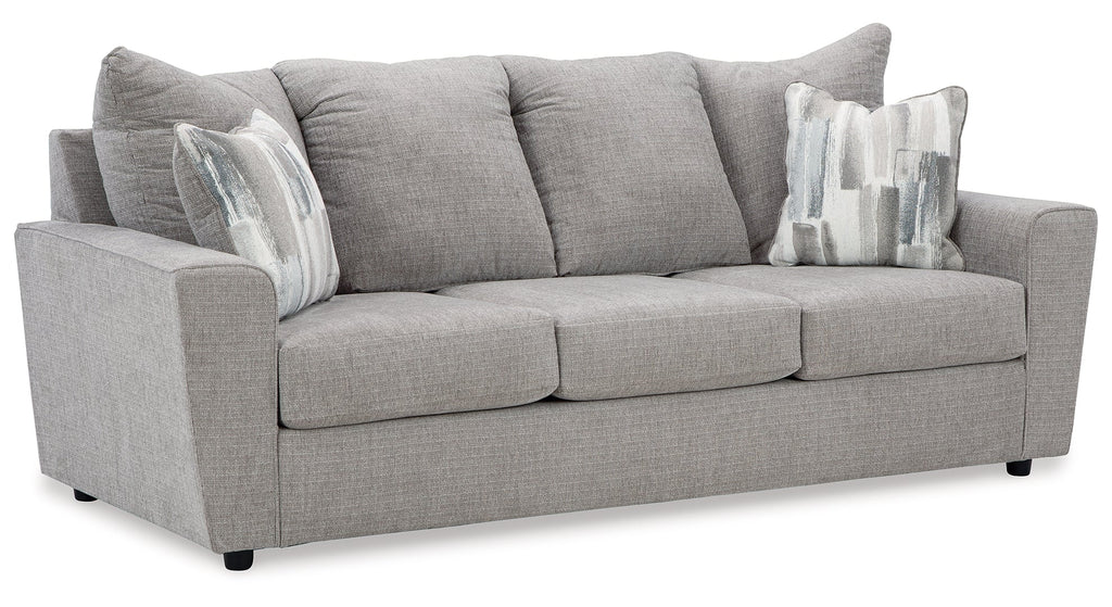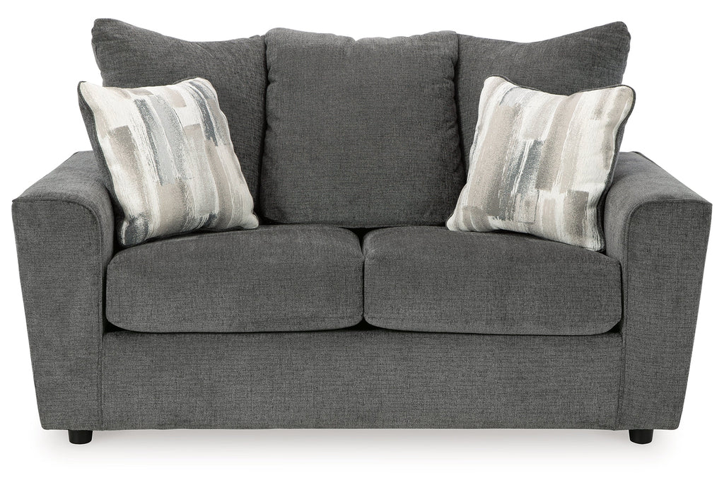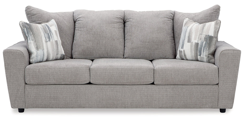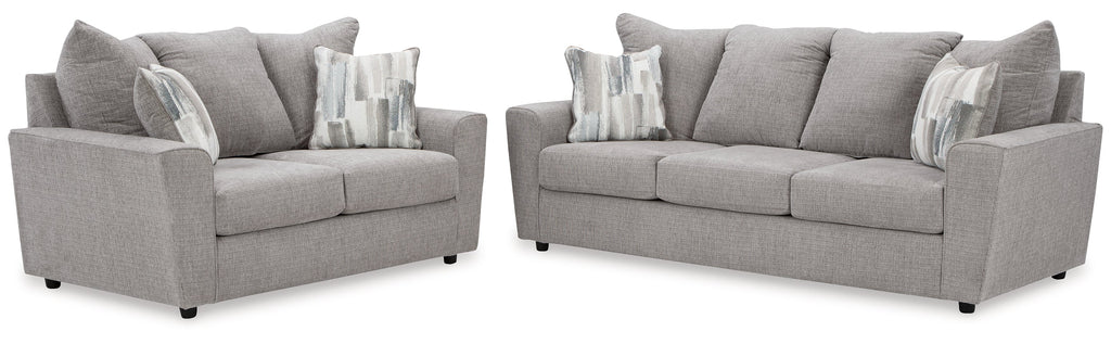 What’s new in neutrals? Shades of gray, of course. Embrace the sophisticated design trend with this sofa and loveseat package, which offers a clean-lined, contemporary style at a comfortably cool price. Sure to lift your spirits, the plush chenille fabric is fabulously neutral. Modern flared arms give it a distinctive flair. This set also arrives with cool brushstroke accent pillows to elevate the taste and comfort level.