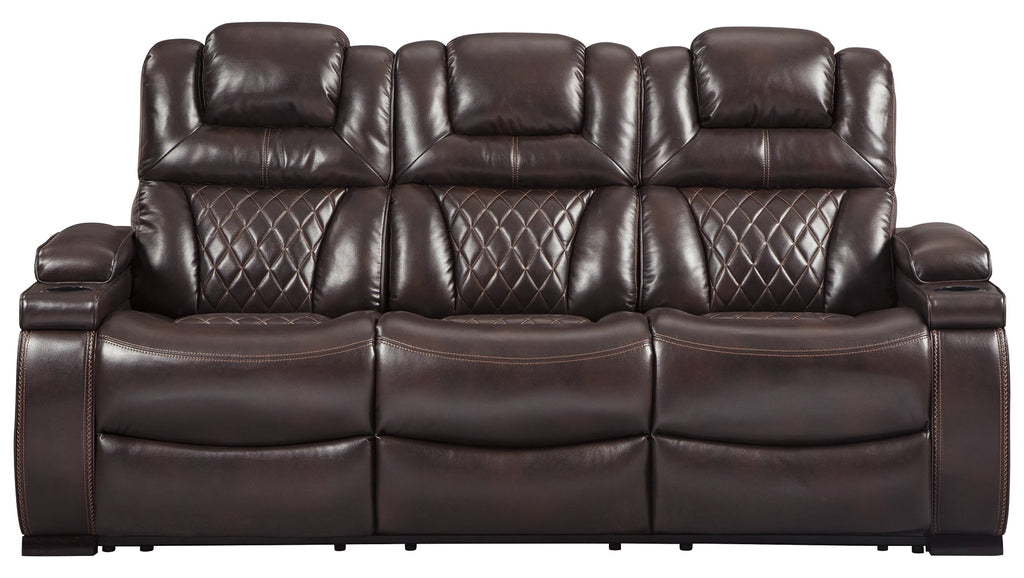 Your modern living room awaits with this power reclining sofa and power reclining loveseat with console. Complete with practical faux leather upholstery, one-touch power controls, adjustable headrests and USB ports, this living room set makes finding the best seat in the house a breeze. Cup holders and a storage console keep drinks, snacks and remotes close by. What a perk that the sofa’s center seat is crafted with a drop-down table with power/USB plug-ins and dual cup holders. Go ahead—treat yourself to a high-design home theater experience, priced to put you at ease.