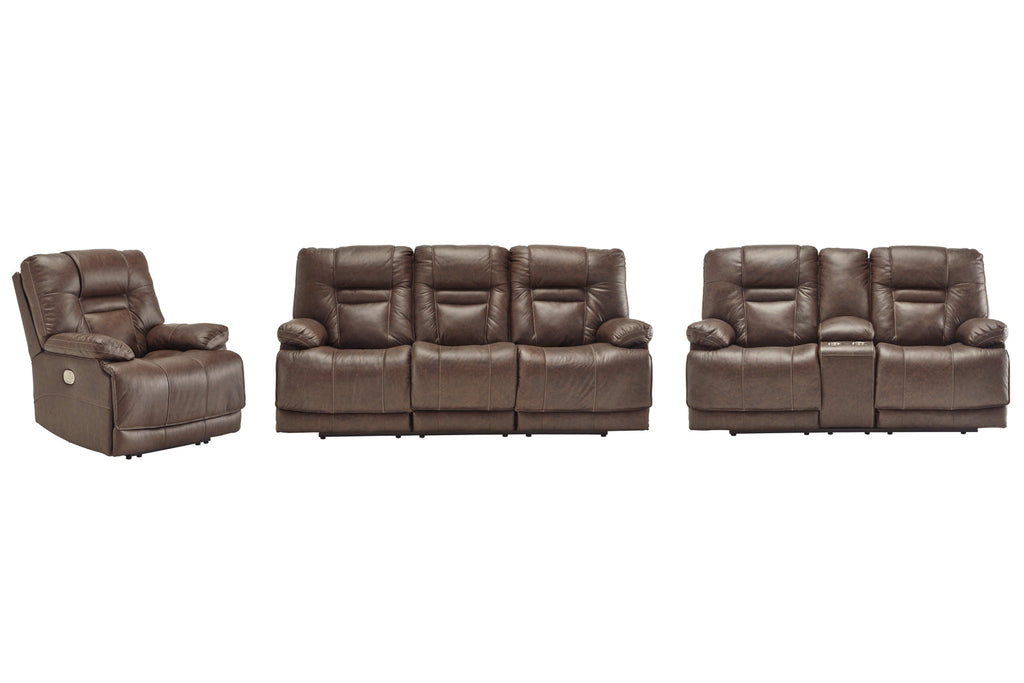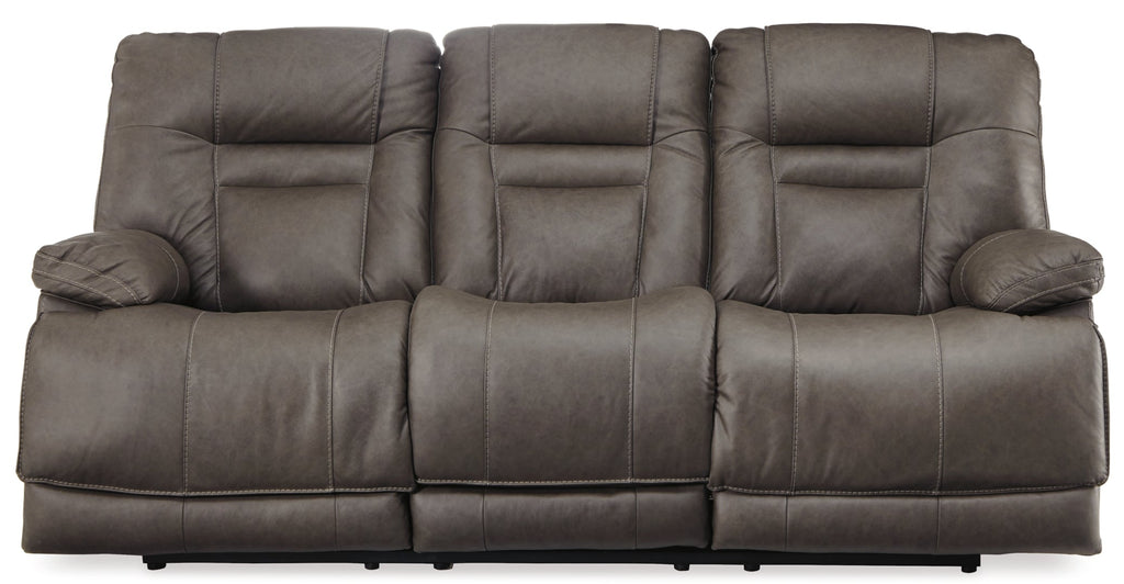 Big and bold, this two-piece power package includes a power reclining sofa and power reclining loveseat with console. Both feature Easy View™ power adjustable headrests for maximum comfort at the touch of a button; easily position the recliner, its headrest and lumbar support to your liking. Convenient USB ports let you charge cell phones or laptops without getting up. The look and feel of genuine leather surrounds you in the cushioned seat, interior bustled back cushioning and pillow top armrest, while faux leather back and sides allow affordability. Ideal for a modern or casual setting, the smoke-colored upholstery has an effect that creates a rustic look.
