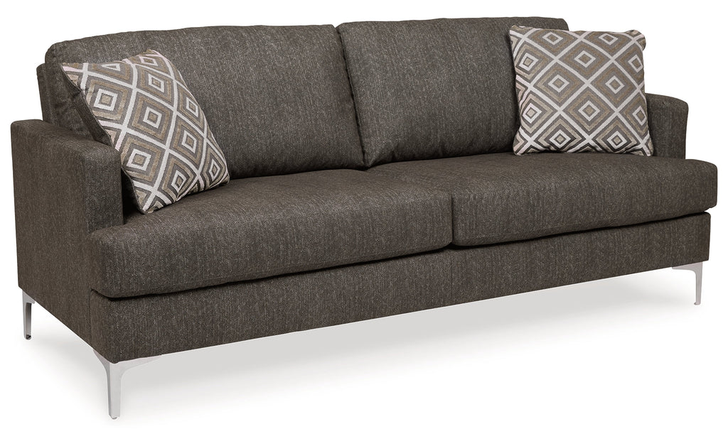 If modern subtlety is your style, settle into the heavenly texture of this sofa and loveseat package. The tremendously soft upholstery has a slight herringbone pattern that adds depth and richness to the java color. The metal accent legs elevate this set, as well as the style of it, and add a decidedly chic sense to your space.