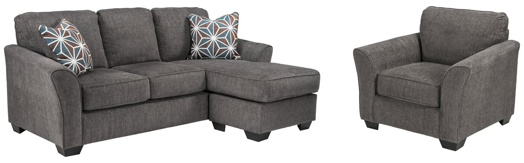 This sofa chaise and chair set is so casually contemporary. The 1970s era meets modern day allure with an energetic geometric pattern on the toss pillows. Paired together with slate colored menswear chenille, it’s incredibly comfortable and a show stopping sight. Versatile chaise has a movable ottoman and reversible cushion that can be used on right or left side.