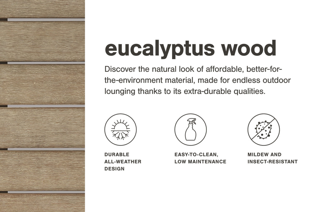 An effortlessly elegant choice in outdoor furniture, this outdoor seating group marries sturdiness and style in such a delightful way. Better yet, it has the edge when it comes to affordability. For that much more weather protection, the eucalyptus wood frames are treated to a 5-step finishing process. Sumptuously soft yet remarkably durable, the included cushions and pillows are wrapped in a high-performing, low-maintenance Nuvella® fabric you’re sure to love.