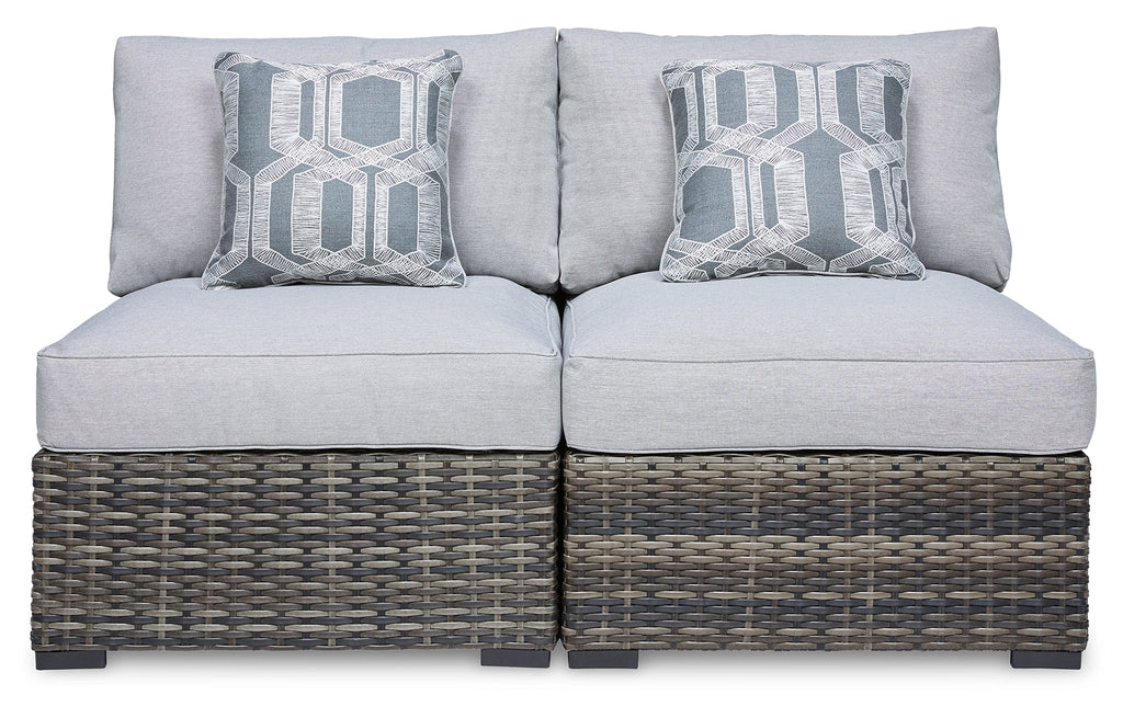 - Includes 2 outdoor armless chairs with cushions, 2 corner chairs with cushions, 3 consoles with drink holders and 2 outdoor curved loveseats with cushions