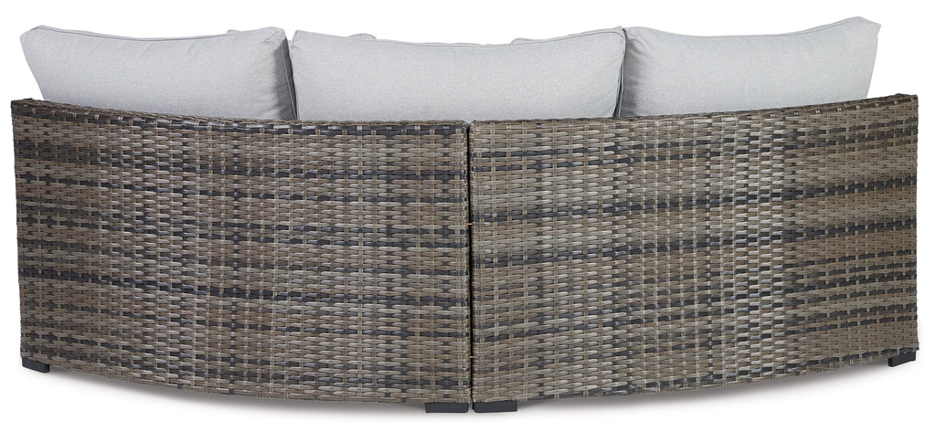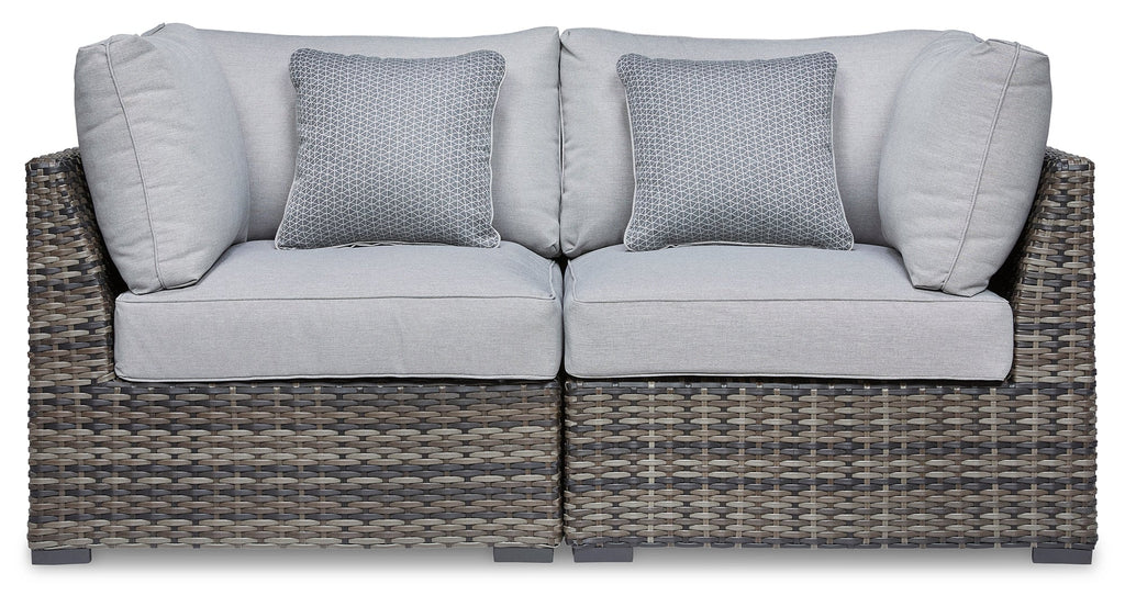 This cool, casual Harbor Court outdoor sectional will raise the comfort level and visual appeal of your outdoor living space. Made with handwoven wicker in neutral tones of light and dark gray, it blends beautifully into your lanai or pool and patio area. This sectional's thick, comfy cushions are wrapped in Nuvella® high-performance fabric that is stain resistant, fade resistant and easy to clean. Its modular design can be reconfigured to suit your needs and keep a fresh look. Throw pillows are included for added comfort and a splash of color.