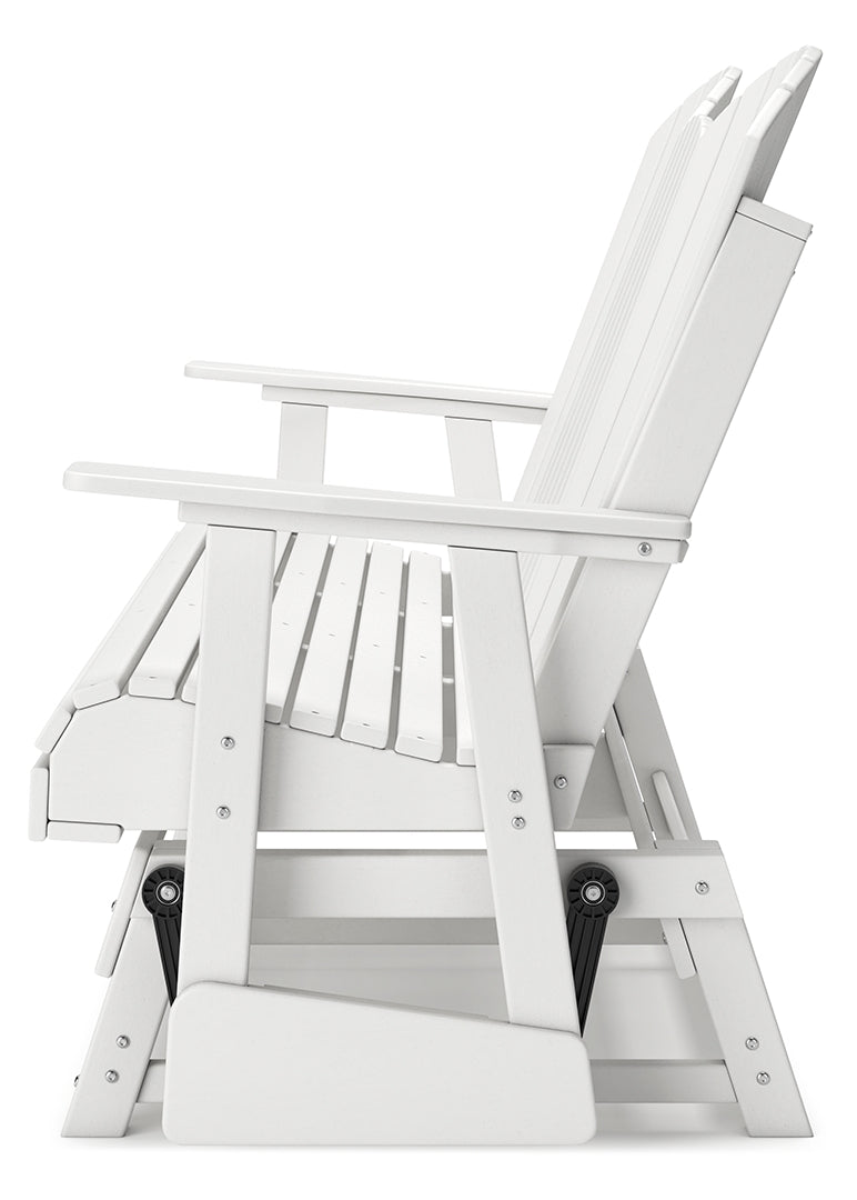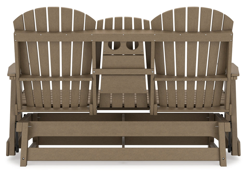 Drift away from everyday worries and into outdoor bliss with this glider loveseat. Dressed in an inviting driftwood hue, the Adirondack-inspired design has a classic feel. It weathers sunny summer days and cozy winter nights with durable MEGA TUFF™ HDPE material. A drop-down console with integrated cup holders keeps refreshments and snacks within easy reach. With the console snapped into the back, this loveseat has even more room for enjoying lazy days in the shade.
