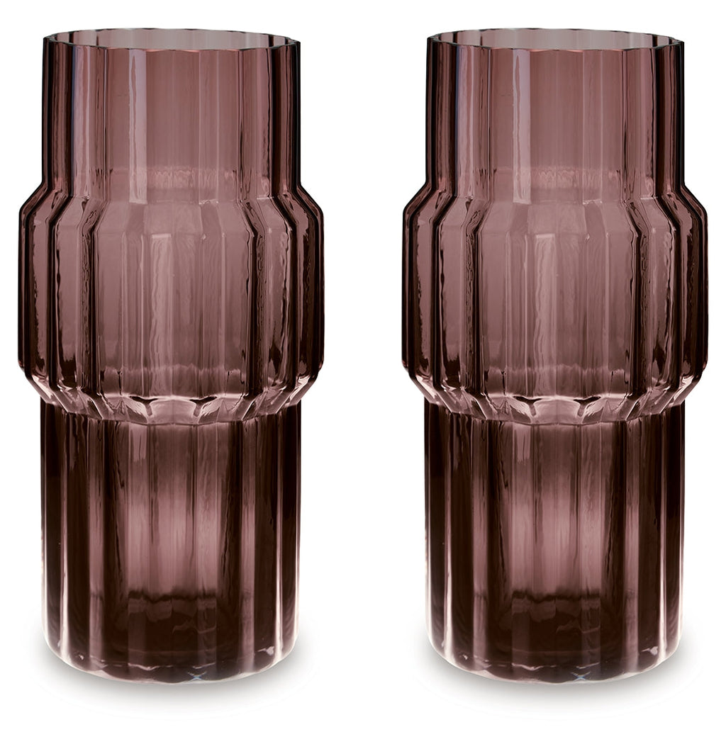 This vase, made of dark mauve-tinted glass, adds a captivating touch to indoor or outdoor decor. Its unique textured shape with oversized fluted detail creates an elegant art piece. Whether it's accentuating flowers or candlelight, this vase is simply striking from every angle.