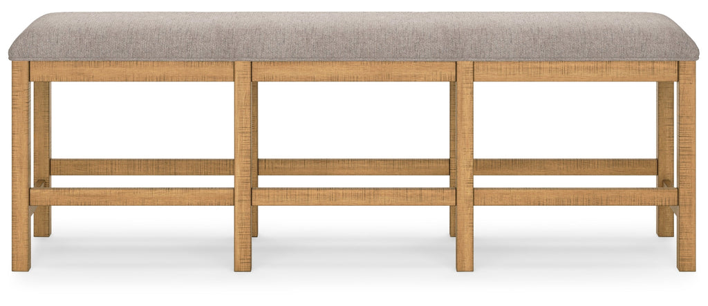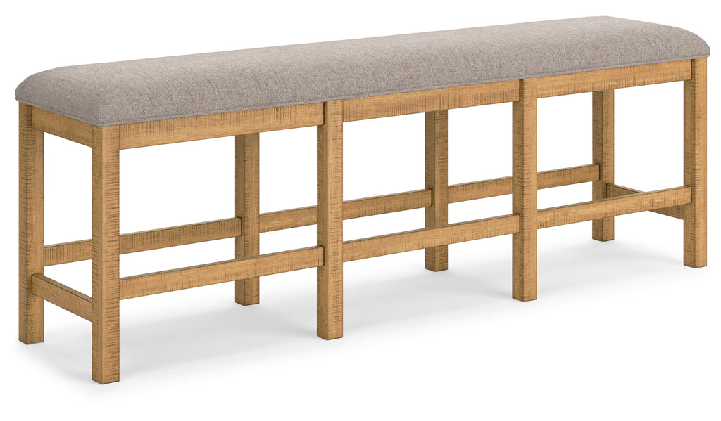 This counter height dining bench is a favorite choice for casual rustic interiors. Offering a great seating alternative, it's your answer for impromptu guests. And the textured upholstered seating? Deliciously versatile and comfortable.