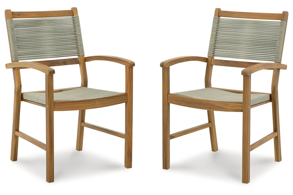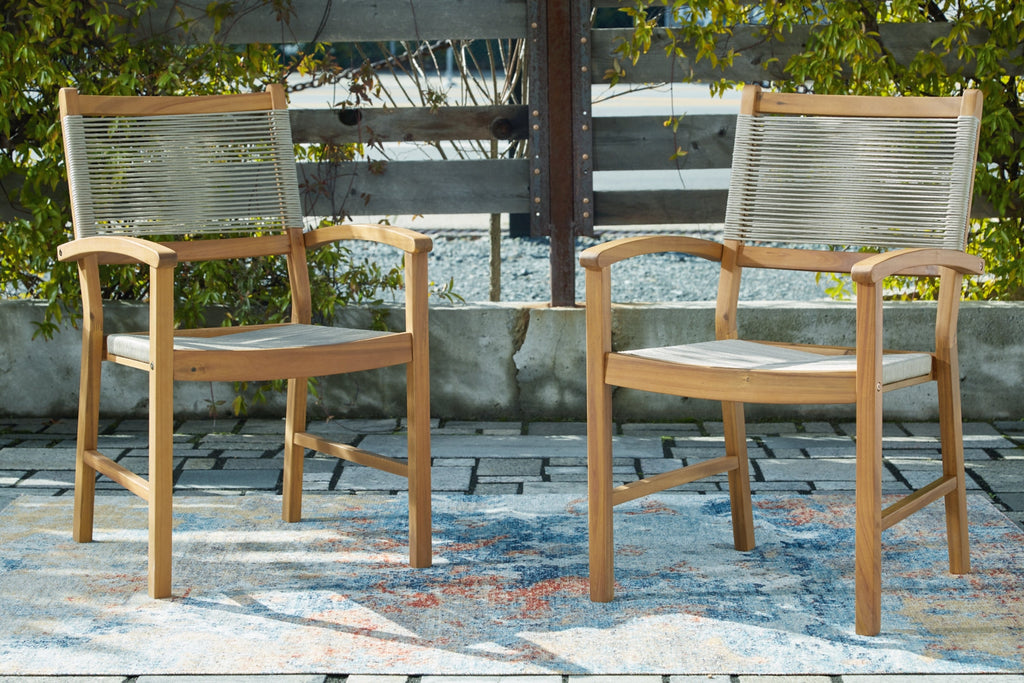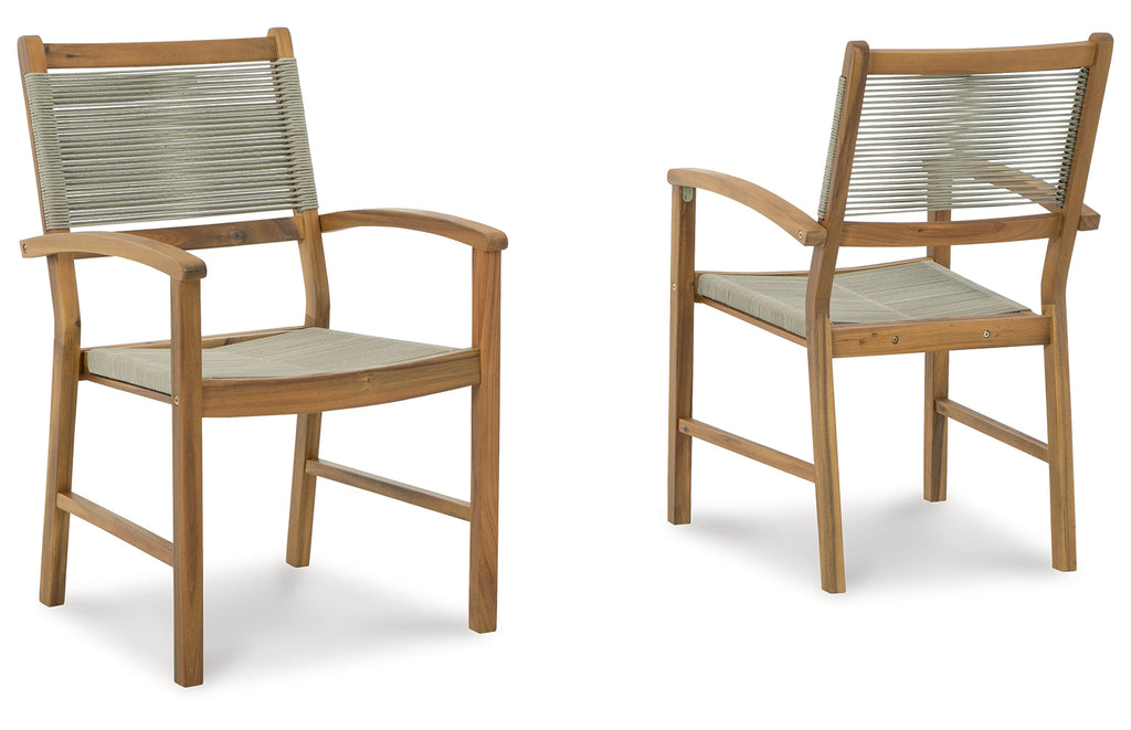 There’s no need to be stuck inside when the weather is perfect. Enjoy alfresco gatherings with this outdoor dining arm chair set. Made with solid acacia wood, each chair is built to keep its looks with a beige rope back and seat. Full of natural charm, you’ll love soaking in the scenery from here.