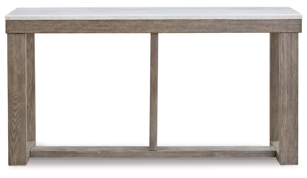 This sofa table is simple in design but big on style. Finished with a trend-right grayish brown wood tone, its bold, blocky profile and natural marble top are timeless classic choices that is ideal for pairing with an ottoman underneath to pull extra seating into the room or remaining clean and sleek on its own. Adding to its beauty, the marble top's color variations, fissures, mineral deposits and veining are naturally formed and are not defects.