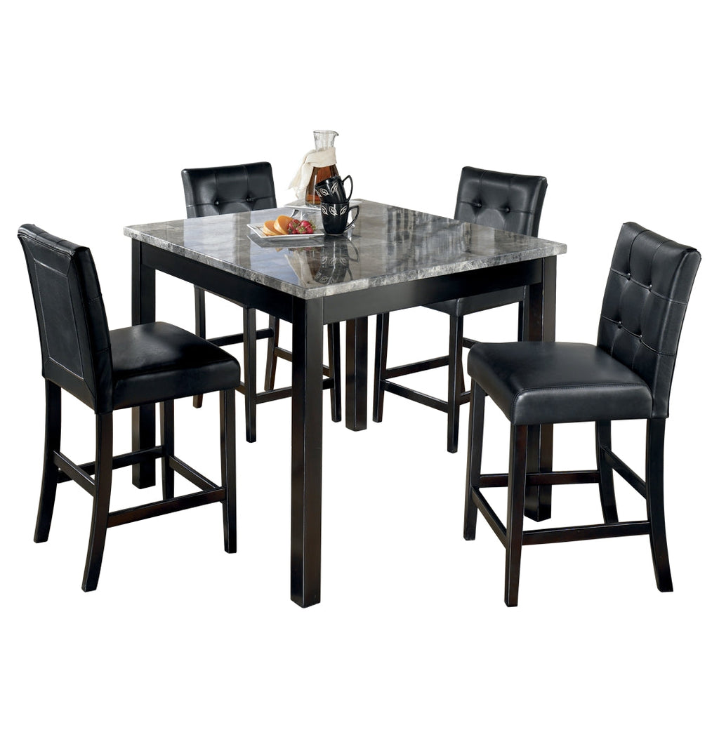 The square shape of this counter height table offers comfortable dining without taking up too much space. Faux marble tabletop has a polished look that's easy to clean. Cushioned counter stools are tufted and covered in faux leather and slide neatly under the table when not in use.