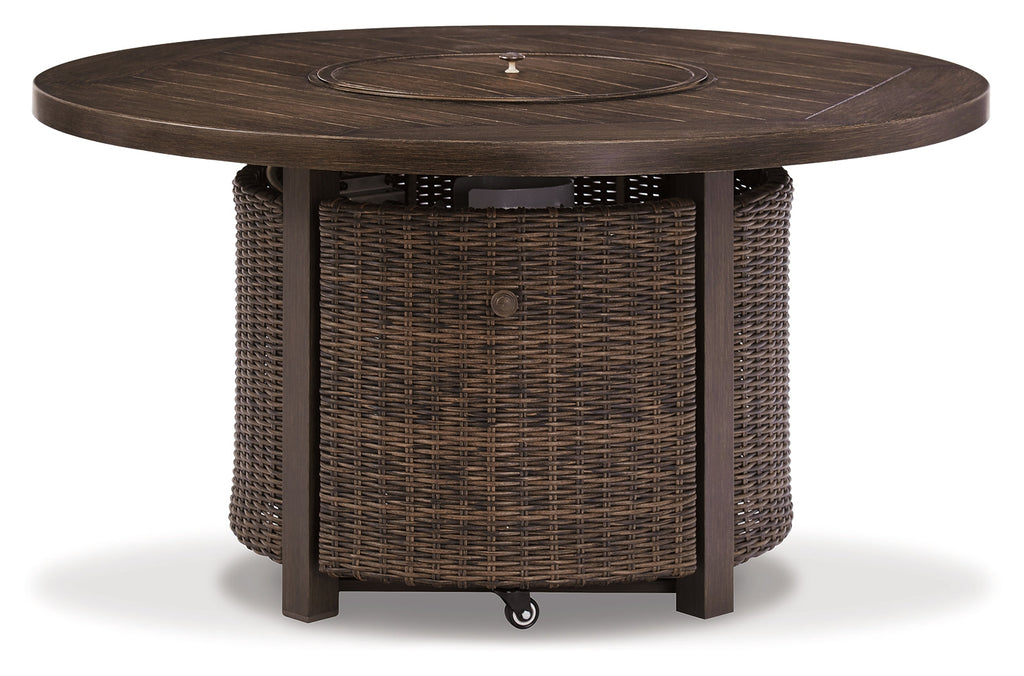 Turn your backyard space into your own piece of paradise with the Paradise Trail outdoor table with fire pit. Though this outdoor table looks remarkably like wood, it’s made of sturdy, rust-proof aluminum that’s perfectly suited for alfresco living. Enhancing the rustically refined aesthetic: side panels accented with all-weather, handwoven resin wicker. The result may look high maintenance, but rest assured, this outdoor fire pit table is anything but. With the press of a button, ignite a flickering flame that dances over a bed of glass beads. And with room for up to eight, it’s one highly accommodating outdoor bar table.