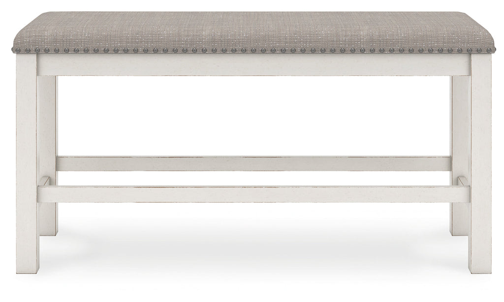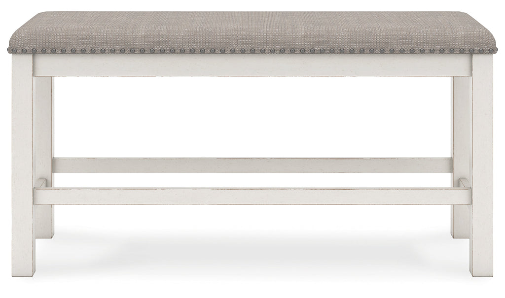This counter height dining bench is sure to impress come mealtime. With its white finish and light gray upholstery, farmhouse-style seating has never been so fashionable. All that’s missing is you and your family.