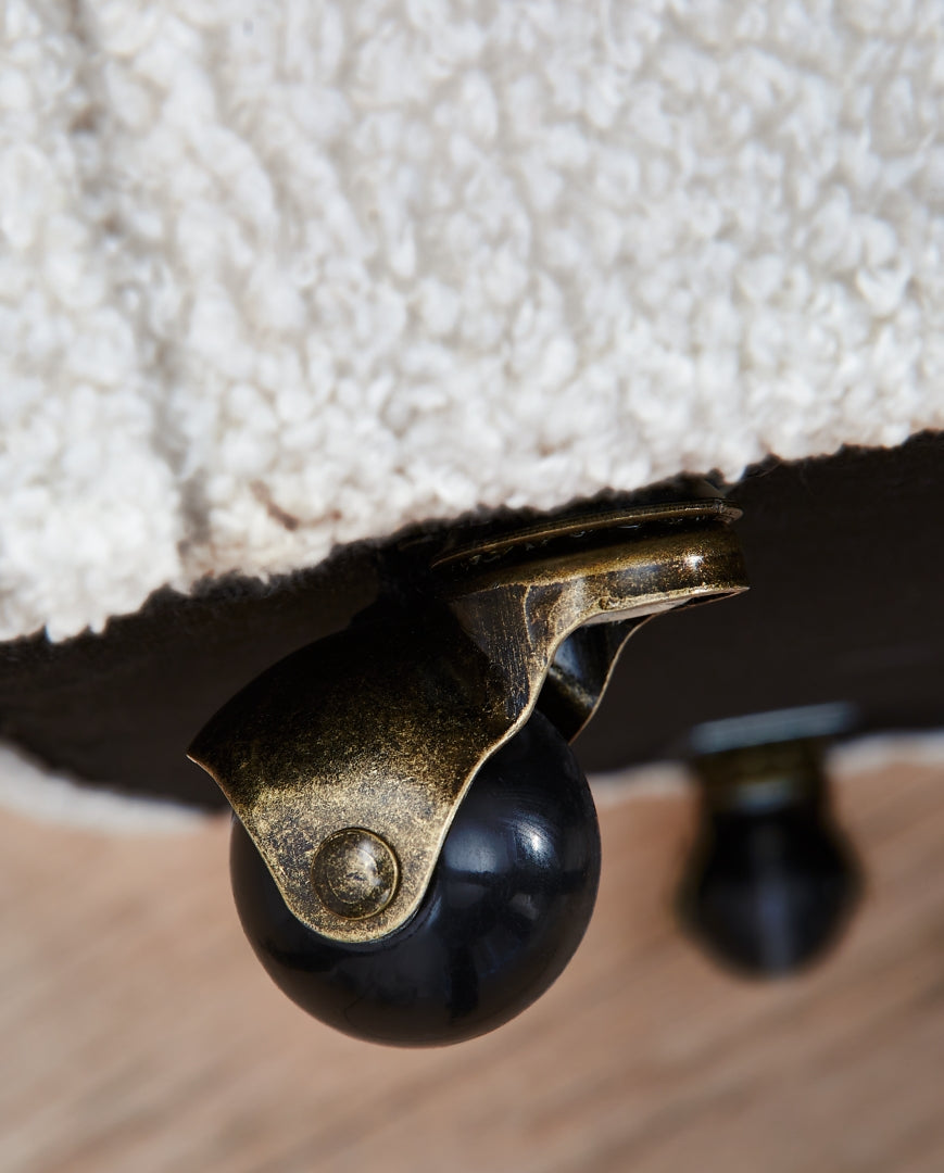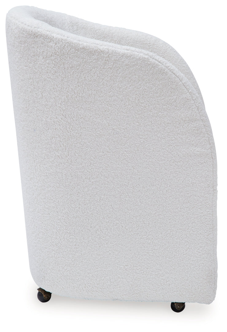 Inspired by art deco design, this fully upholstered dining chair makes a lasting impression in a simply stunning way. Its magnificent curved silhouette is enhanced with a neutral boucle upholstery that’s so pleasing to the palate. This is the piece you’ve been looking for to elevate your contemporary decor whether you’re dining, listening to your latest playlist or binge-watching with friends. Plus, it’s set on casters so it’s easy to move around.