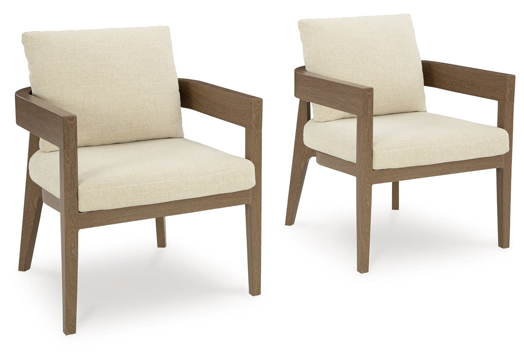 Elevate the appeal of easy-breezy living with this outdoor dining arm chair. Made to look like wood yet suitably durable enough to weather the elements, it's sure to serve you and your besties well, year after year. The gently curved chair features cushions wrapped in Nuvella+™ high-performance fabric for plush refinement.