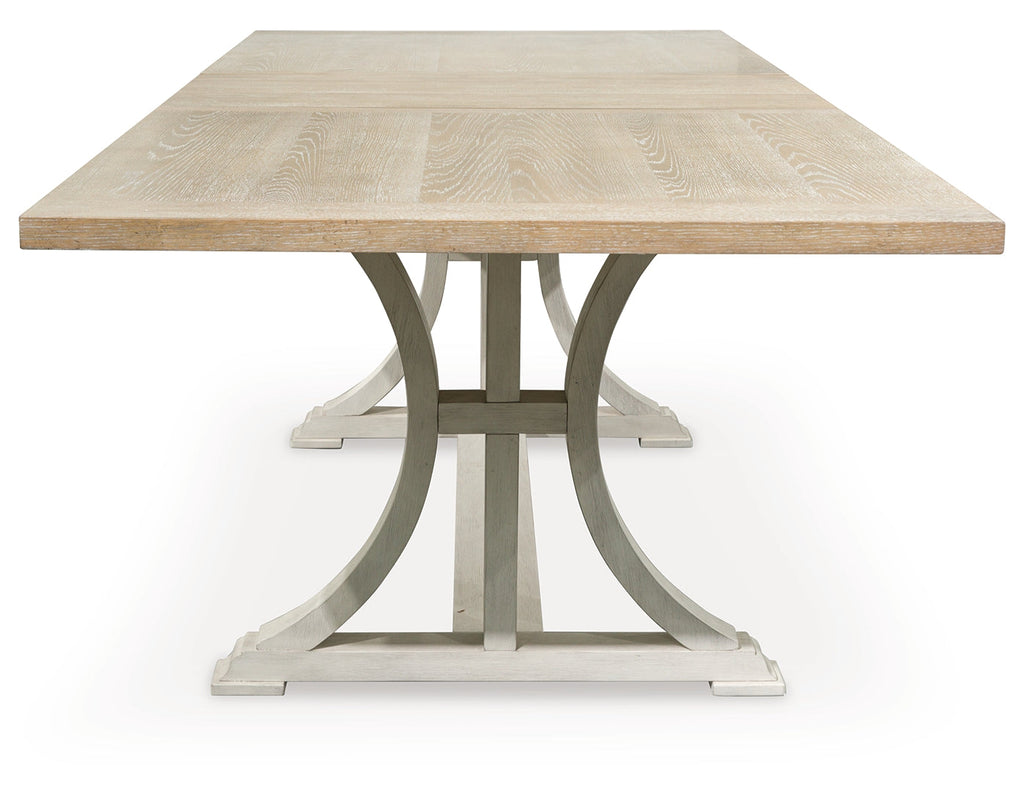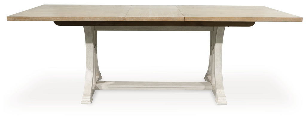 This extension dining table elevates the art of modern farmhouse design. Its charming two-tone aesthetic blends antiqued white and light grayish brown finishes for a feeling of relaxed comfort, while the stylish double trestle base adds a distinctive touch. An extension leaf means there's always room for more guests. Now your only worry is what to serve for dinner.